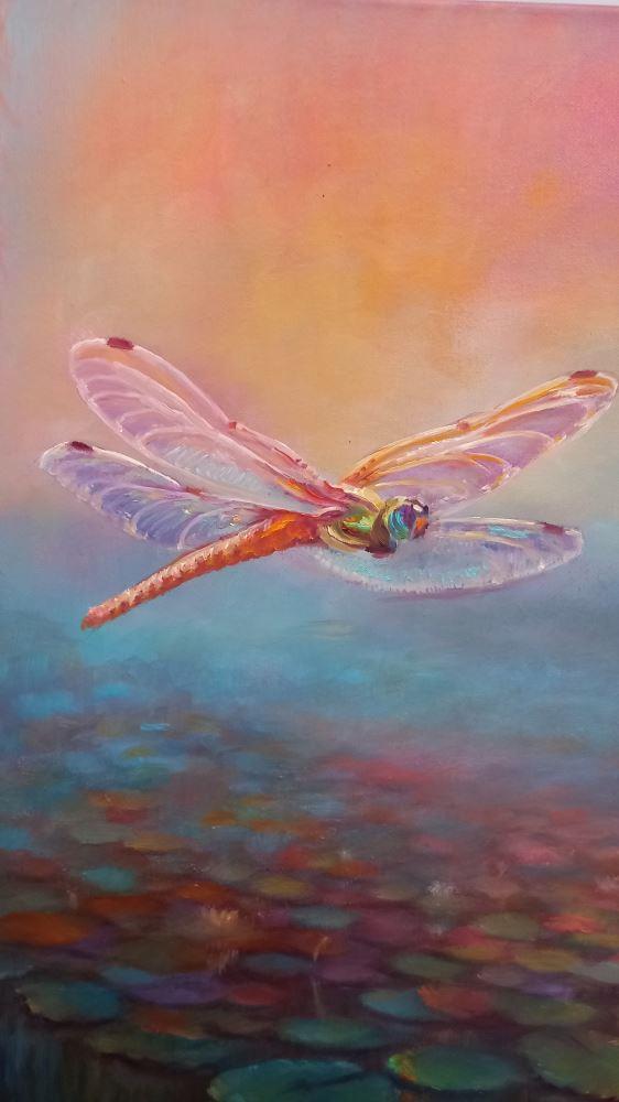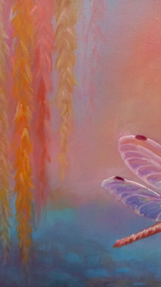 Dragonfly over a lily pond with waterlilies and willow fronds. Dragonflies are considered messengers from beyond in folk lore.