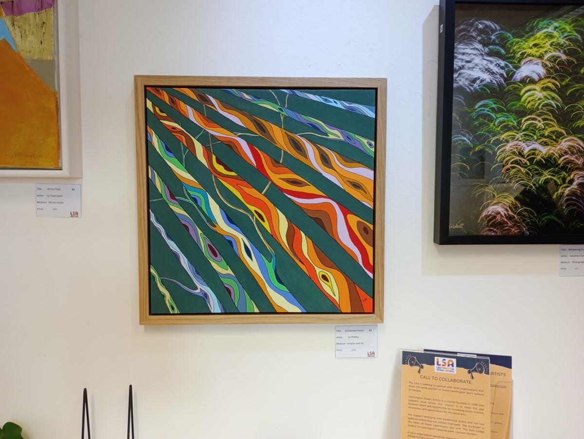 A dreamy abstract landscape depicting a canopy of multicoloured trees in a dark forest. The swirling patterns on the tree trunks lend a magical feeling to the scene.