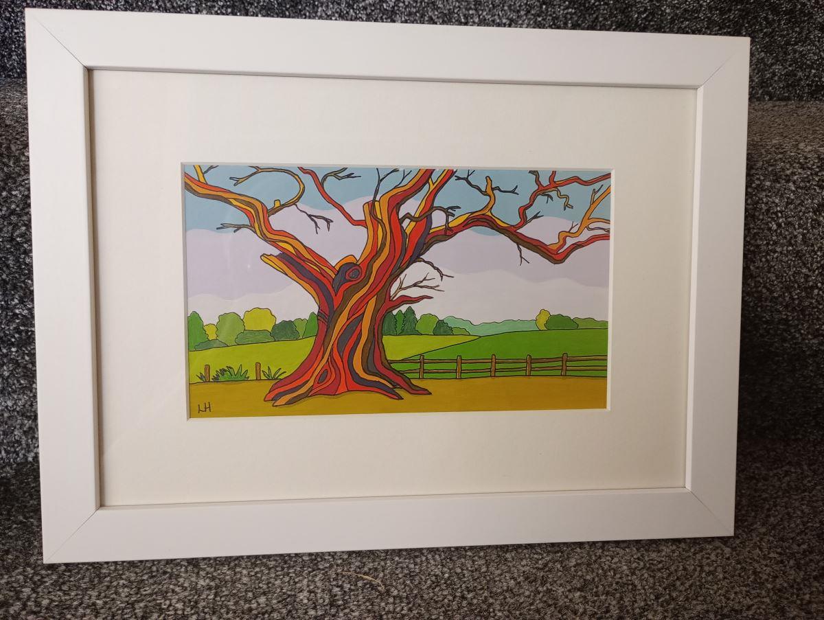 Colourful original painting of an old gnarled tree on a background of rolling green fields. Painted in acrylics with ink outlines on A4 acrylic paper, mounted and framed. The frame is white wood and includes real glass, with title and artist signature on the back. The painting was inspired by a walk in the grounds of Thoresby Hall, Nottinghamshire.