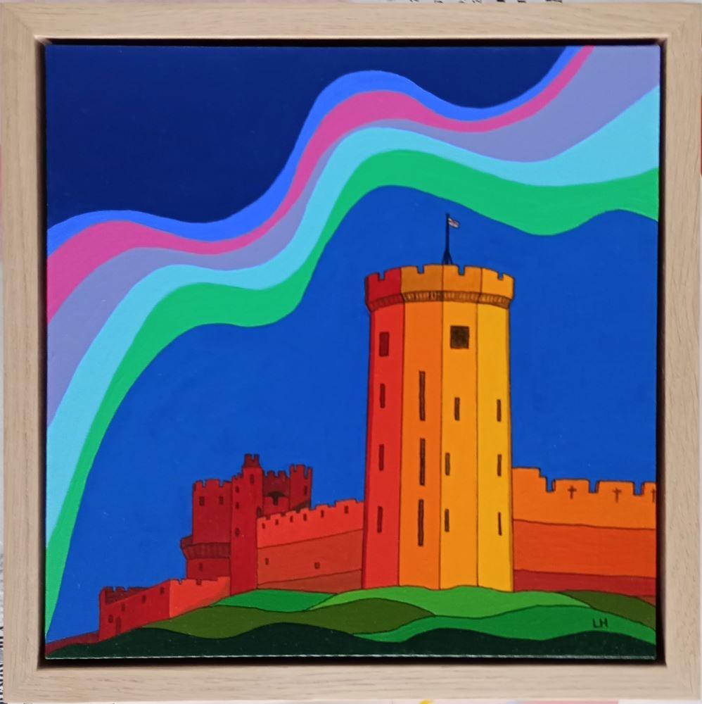 This painting depicts a stylized and vibrantly coloured interpretation of Warwick castle at night. It features Guy's Tower in bold yellow hues, while the ramparts to the left are in shades of red. The sky above is a solid, deep blue, which is contrasted by a whimsical, multi-coloured wave arching from the upper left to the upper right, lending a dreamlike quality to the scene. The overall atmosphere is cheerful and imaginative, and the mood is light-hearted and fantastical. The style is simplistic and graphic, reminiscent of mid-century modern art, with bold colours and clear lines.