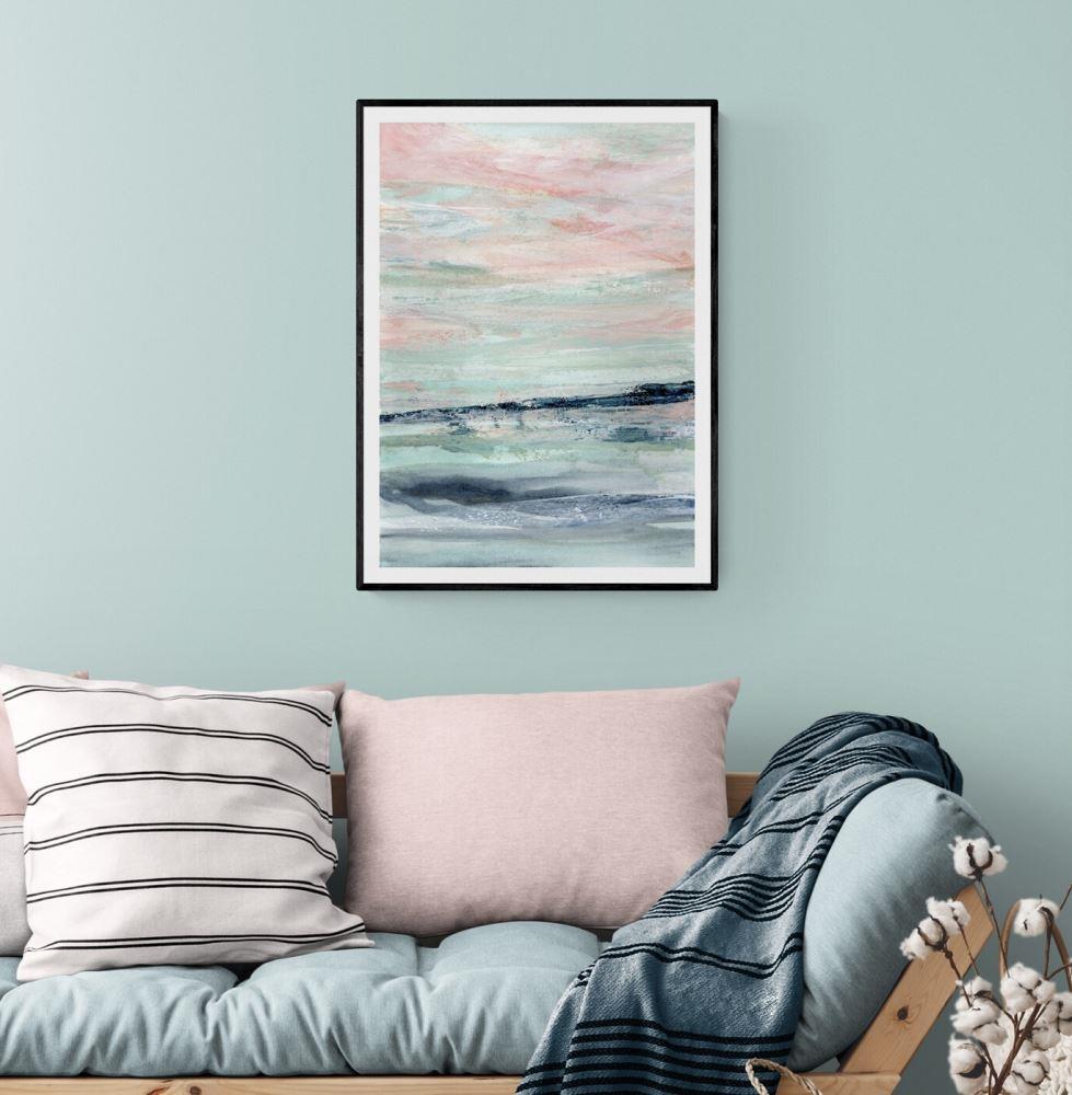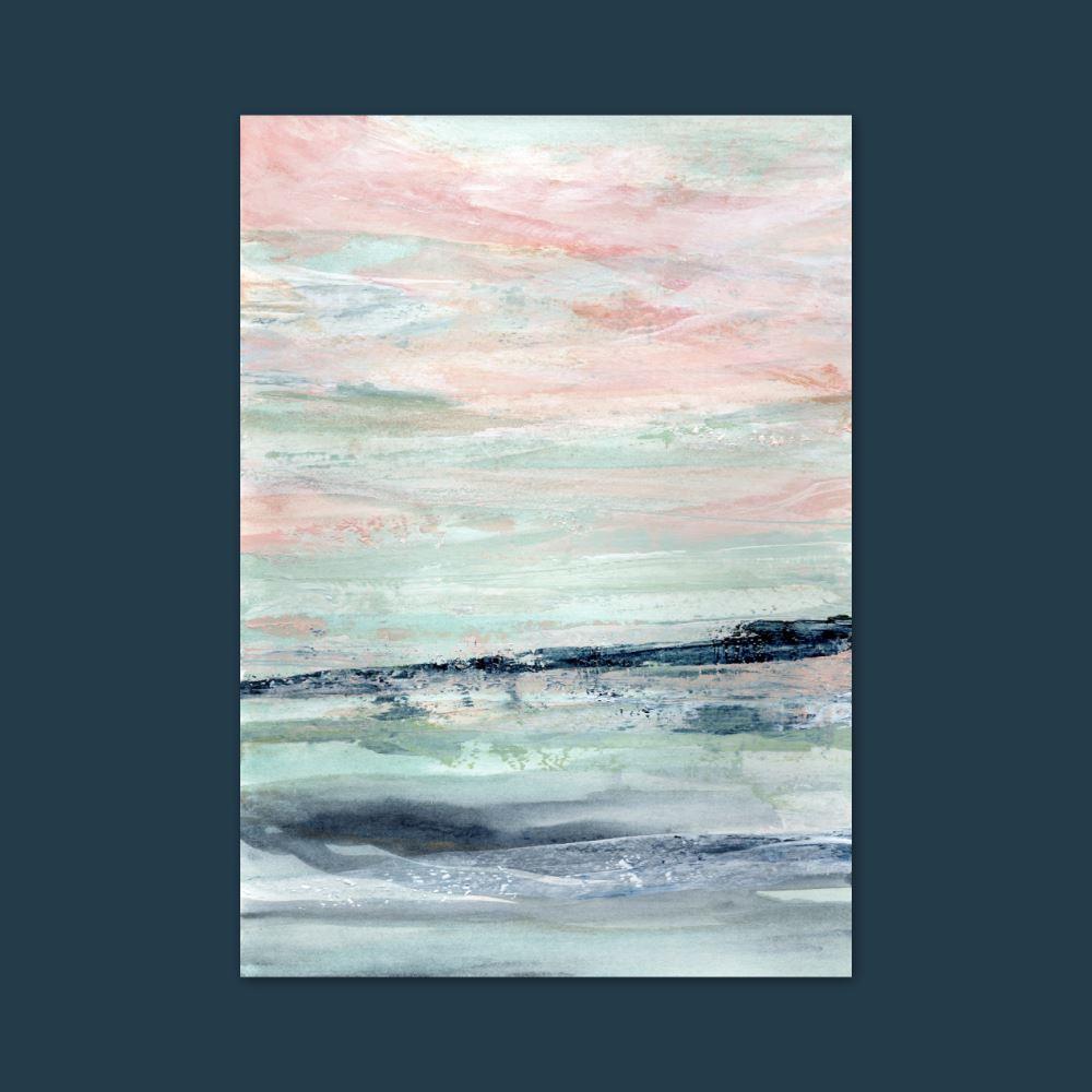 'Dreaming of a Walk by the Sea' print of acrylic & watercolour semi abstract seascape art. The 'Dreamy Seascapes' collection is inspired by those walks by the sea when the sea feels almost dreamlike with beautiful aquamarine waves and a shimmer dancing across the waves.