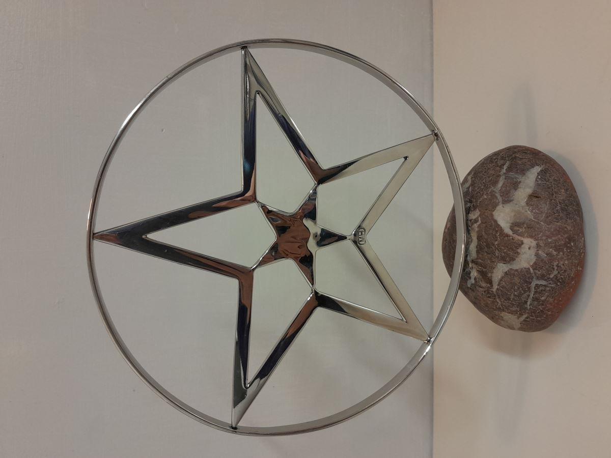 Exquisite fabricated polished stainless steel star mounted upon a Tasmanian River pebble