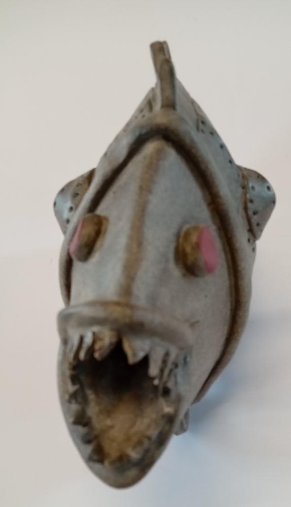 A steampunk fish, armour plated with rivets and red teeth and eyes looking very fierce. Funny and whimsical, ideal in an office or man cave. Fishes need wheels in the steampunk universe