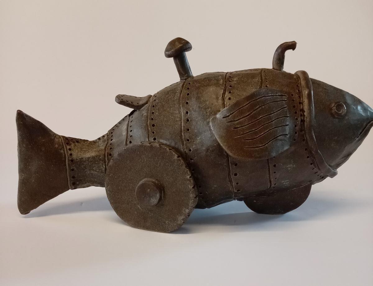 Acrylic on ceramics (A steampunk fish on wheels covered with armour plate)