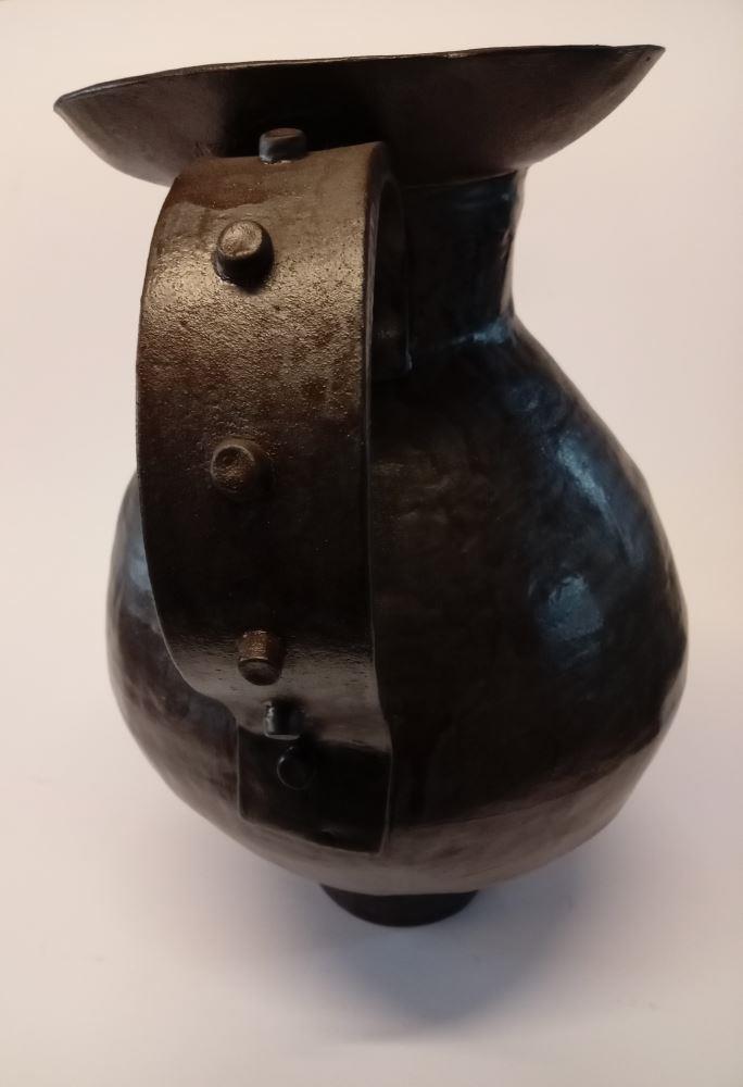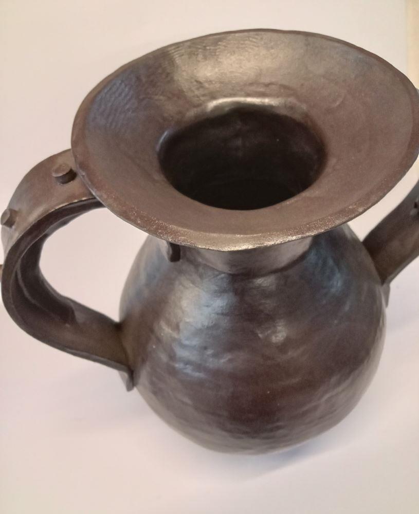 A handbuilt vessel form with shapely handles and foot in black glaze. Unique. home or office.