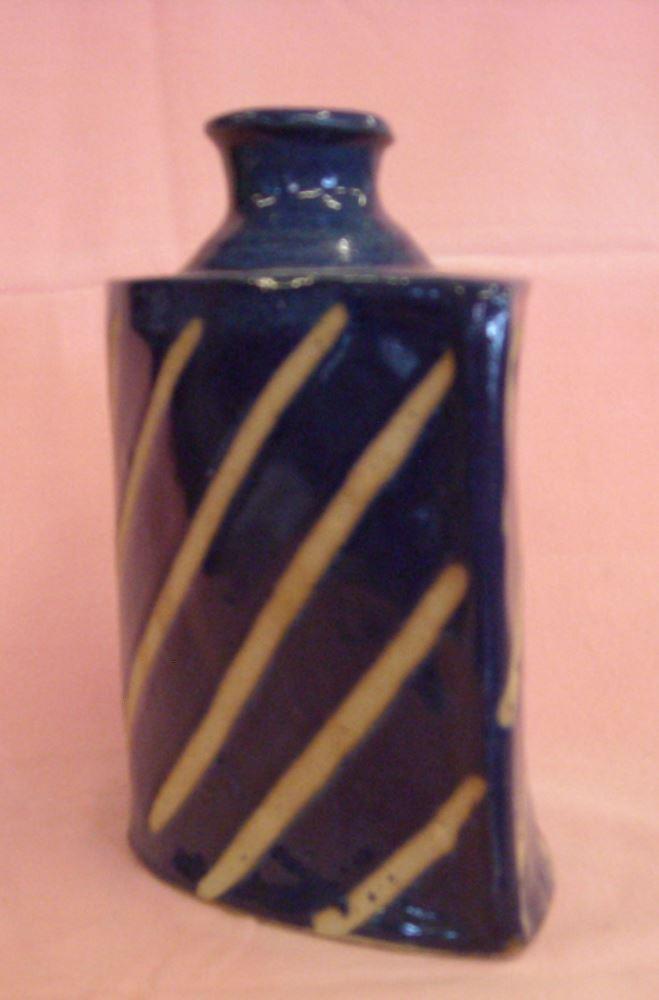 A small oval bottle. Handmade and hand glazed in dark blue glaze with wax release stripes very contrasting. Nice little thing can be useful as a vase for grasses or dried flowers. For home, office or workplace.