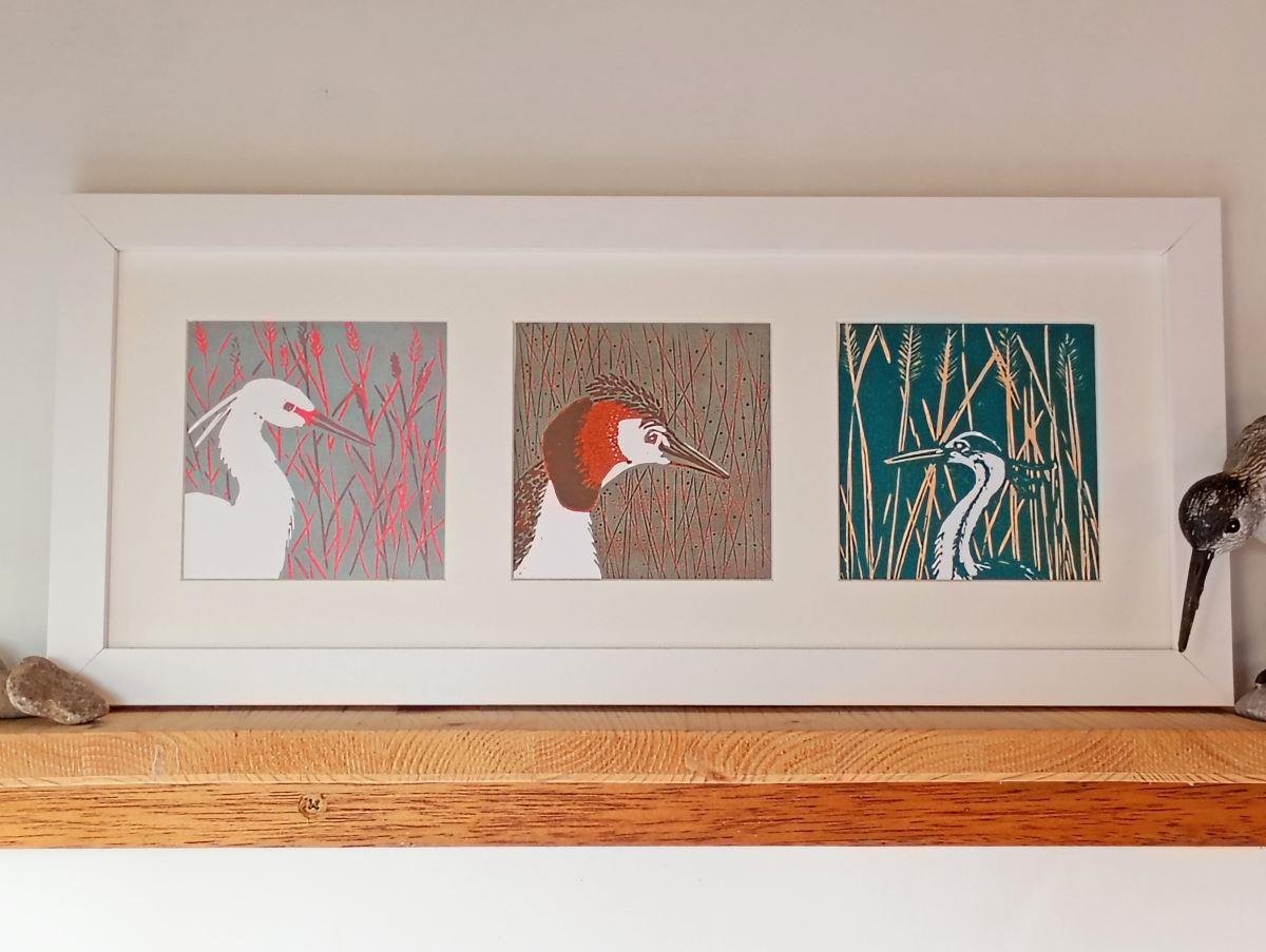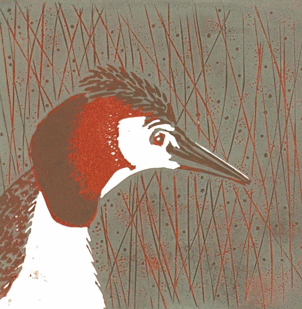 This lovely little grebe would appeal to all lovers of wildlife. He is printed in 3 layers using the reduction method of lino printing, using caligo safewash inks in autumnal shades of brown and russet. He is one of a series of British birds inspired by visits to the Somerset levels nearby, notably