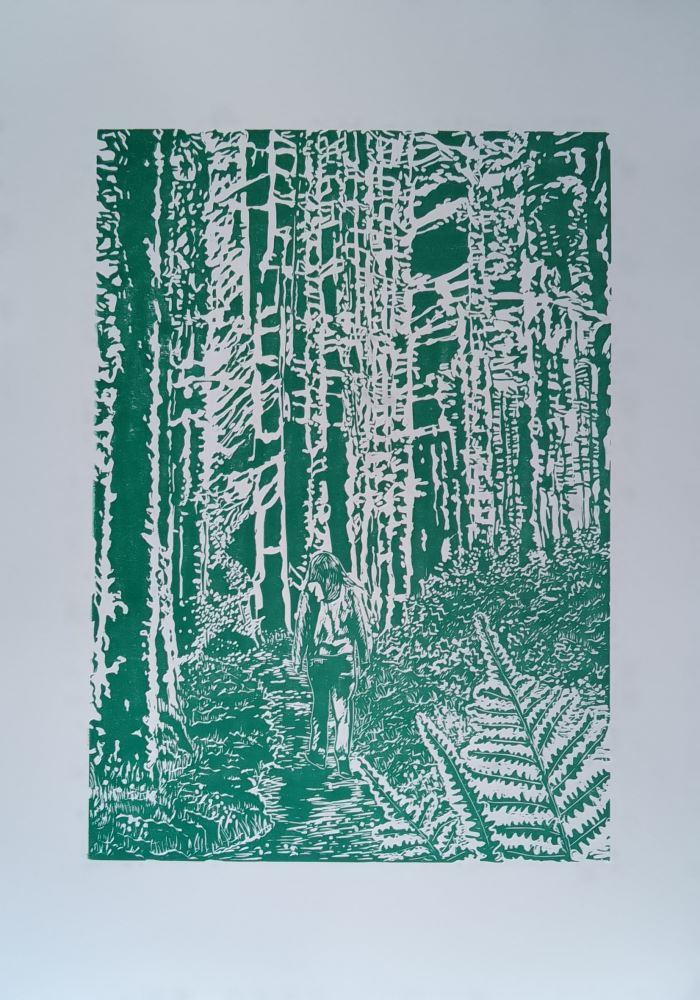 This picture depicts a woodland scene featuring a figure walking along a path admidst tall larch trees. The rtwork in rich green conveys a sense of lushness.