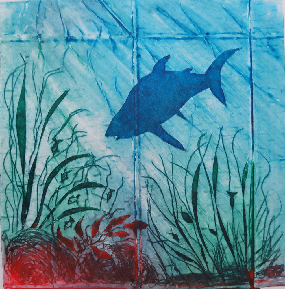 Go on an underwater adventure with this little print featuring a shark in the deep turquoise water and the rays of the sun cutting through. The limited palette gives it a calm strength.