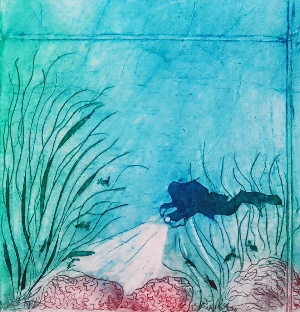 This small drypoint, created using tetra Pak as a plate, has been hand printed in a limited palette and printed onto white paper. it is supplied in a white mount, but left unframed for you to suit your style.