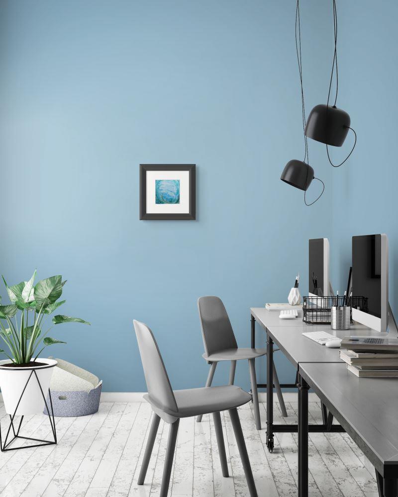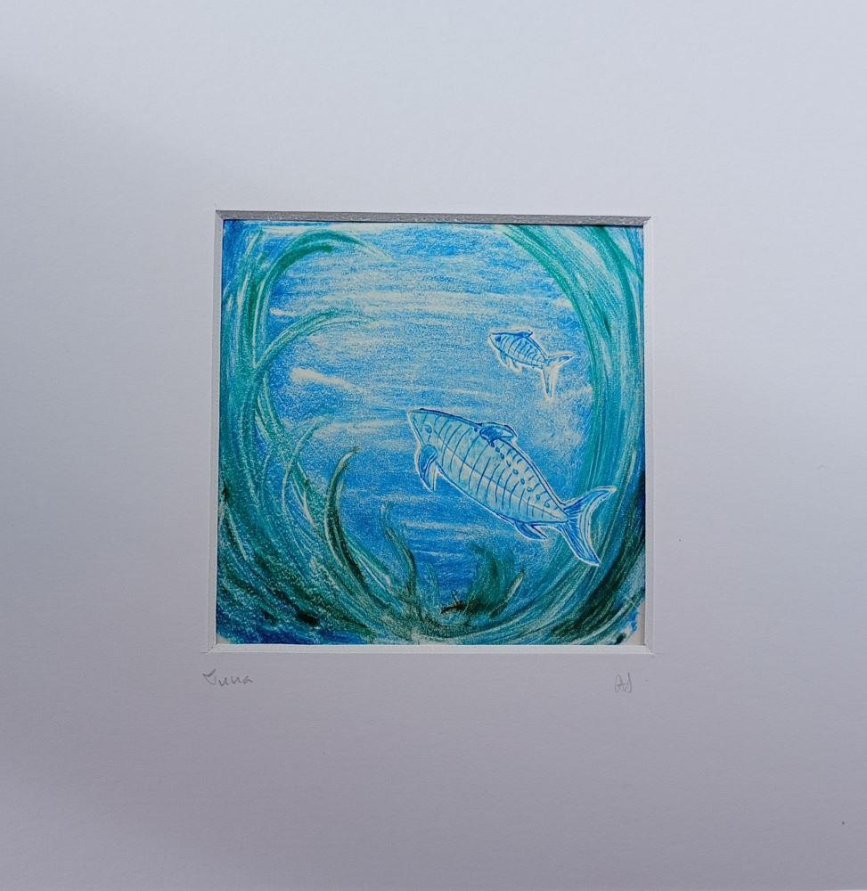 This small square monotype shows an underwater scene. It portrays an aquatic environment with swirling water and tall, curved seaweed framing the composition. Two tuna fish swim towards the right. The background of layered blues and greens with soft textures gives a calm impression.