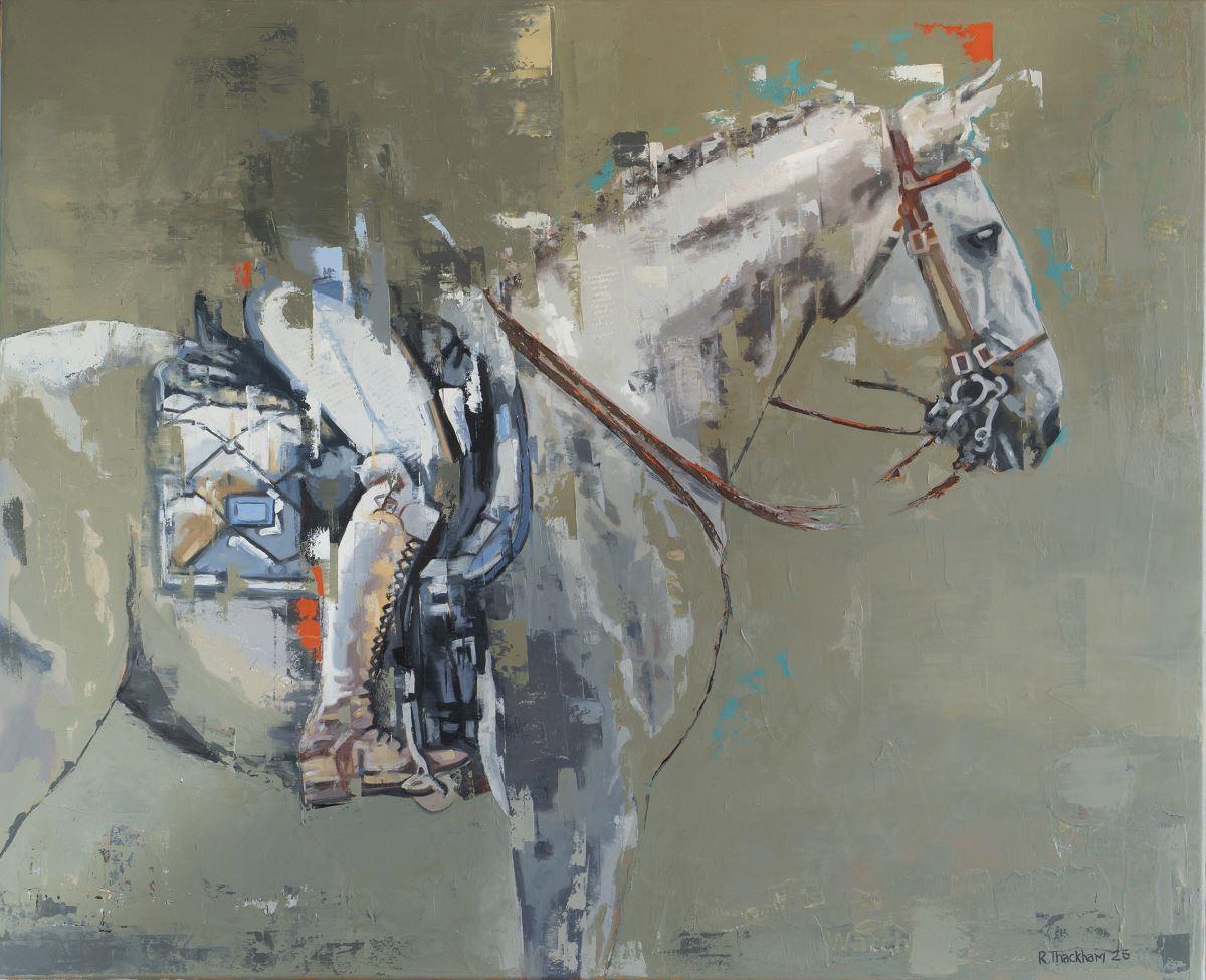 The muted, earthy ground serves as a quiet stage, against which the horse emerges with strength and dignity. The tack and saddle are treated with sharp geometric planes, accented by flashes of orange and blue, lending the composition a distinctly modern rhythm. The interplay of controlled line and expressive texture imbues the work with tension—between restraint and freedom, structure and dissolution.