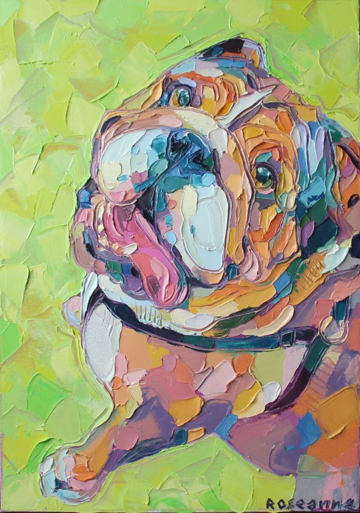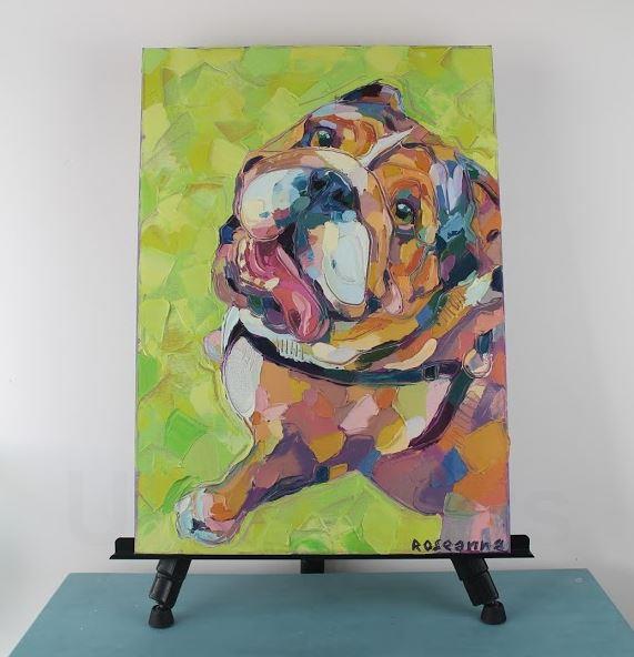 Tongue out and happy to see you, that look which is synonymous with the English Bulldog faithfully captured on canvas. Her use of palette knives creates a bold, sculptural surface of thick paint. The result is a fresh and modern style of pet portrait, perfect for any dog lover.