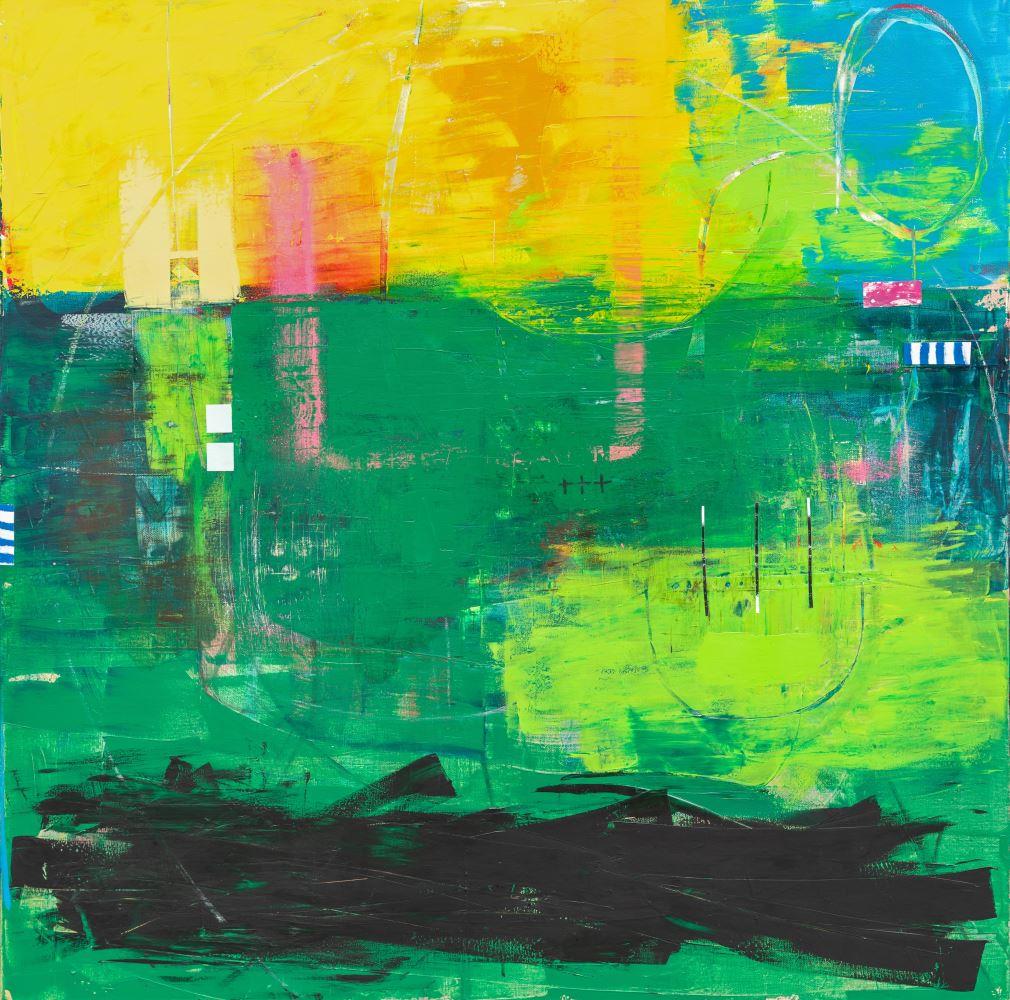 Tethered is an abstract mixed-media painting that balances vibrant energy with quiet structure. Layers of luminous yellow and rich green are built through gestural marks, translucent washes, and linear elements that suggest both movement and intention.