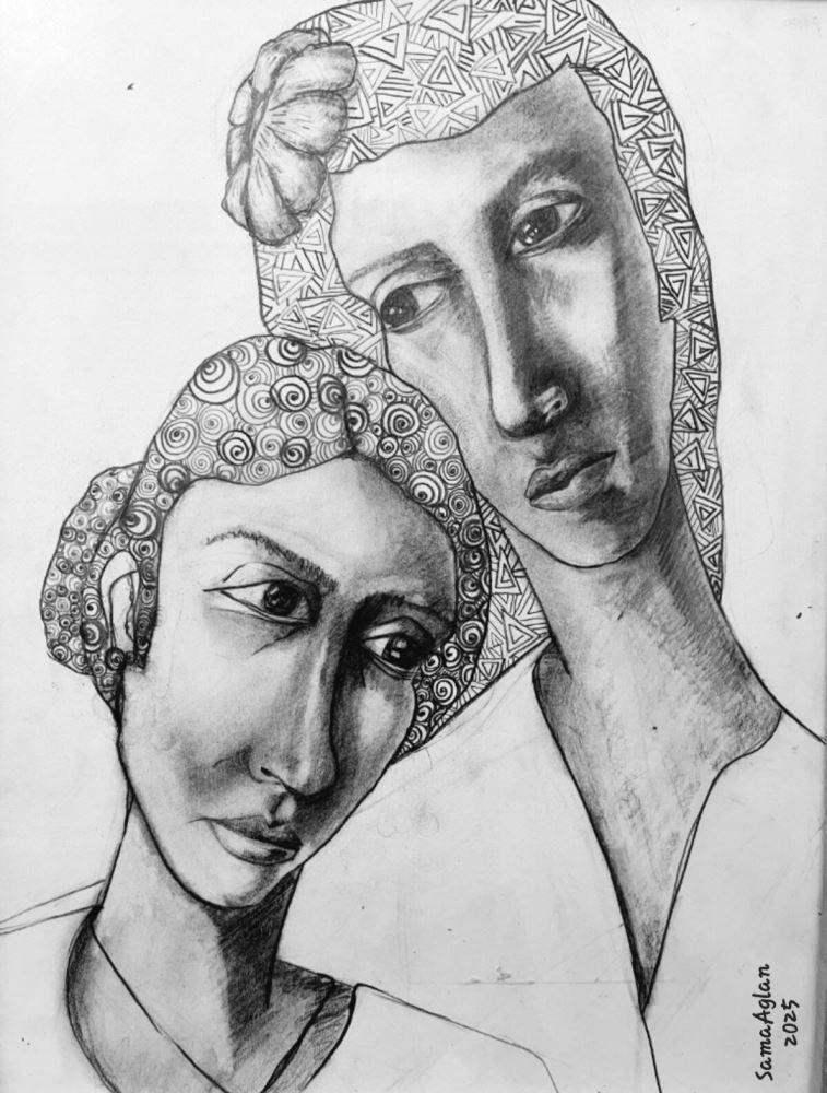 A contemporary figurative graphite drawing depicting two closely connected figures, rendered with expressive facial features and delicate patterned details. The composition evokes intimacy, quiet emotion, and shared presence.