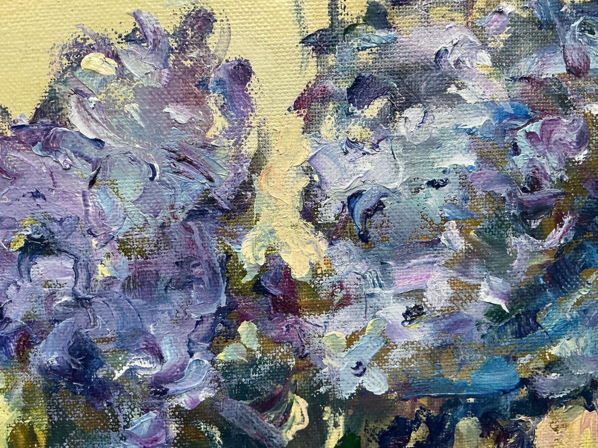 Blue hyacinths in January. Expressive loose brush and palette knife work in shades of blue, mauve and cream. Ready to hang.