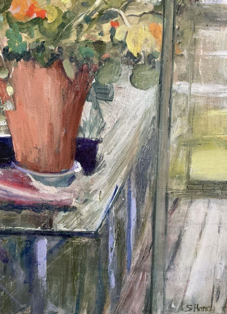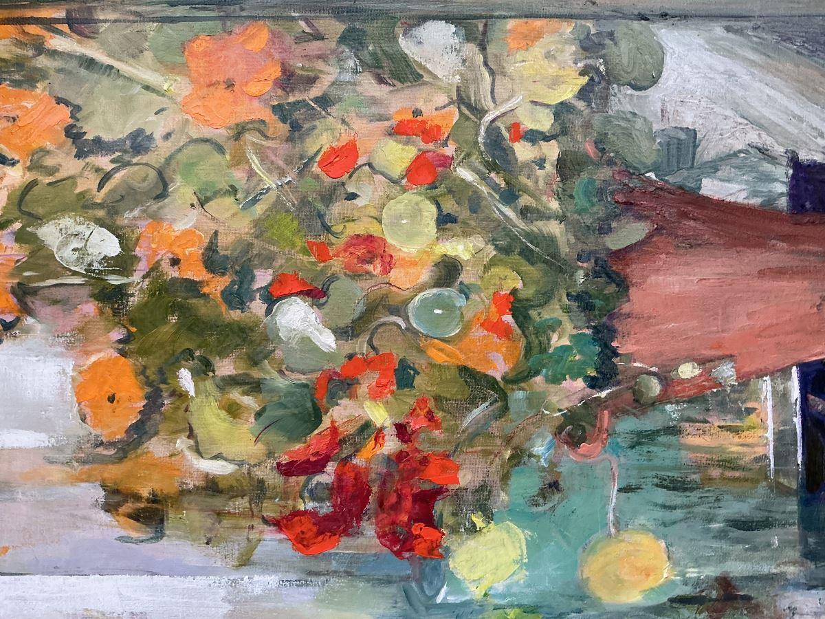 Bright orange nasturtiums bring colour to the winter view from my window.