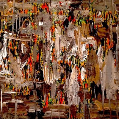 The shingle beach has become something of an obsession reflecting the patterns, shapes, forms, and colours in myriad ways. Paint is spattered, thrown, brushed, diluted, and washed over to express different aspects of the sea and the beach and the elements surrounding it.