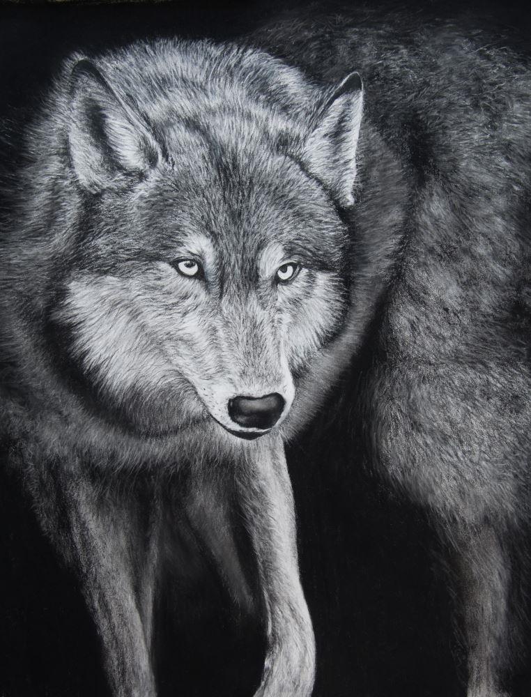 Limited edition giclée print of a black and white pastel painting of a prowling wolf.