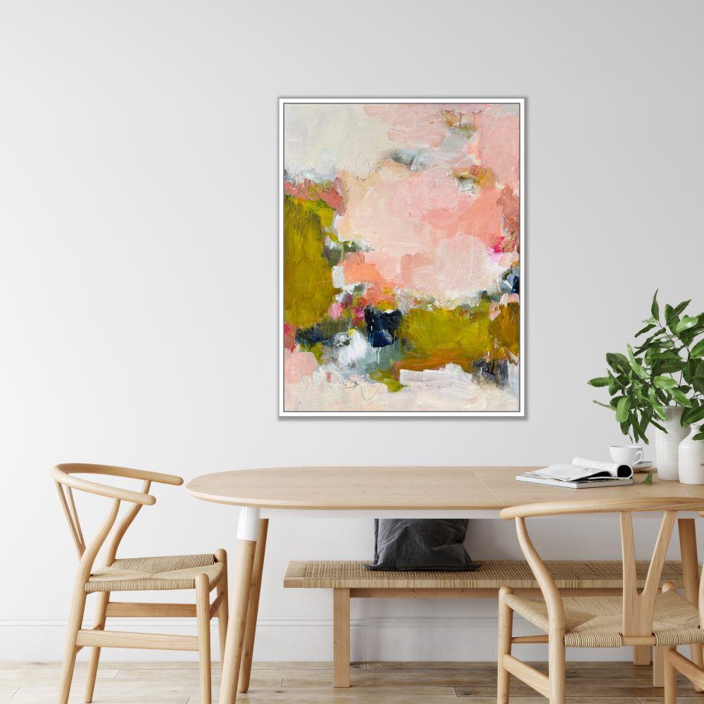 The canvas has been framed in a white Ayous wood tray frame. Hooks and cord are attached at the back – the painting is ready for hanging.