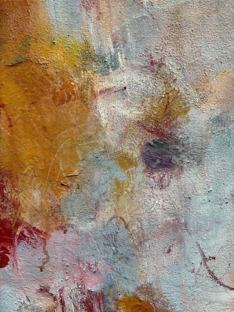This joyful piece will add a touch of warmth to any space. With its soft colour scheme of pinks and yellow ochre, layers of brush strokes and other mark making, 'Into the Playground' captures a mood of ease, fun and sweetness. The painting was created using artist pigments, acrylic, ink, paper, and pencil on canvas. The artist's own paint recipe is used resulting in a high level of pigmentation that brings the artwork to life.