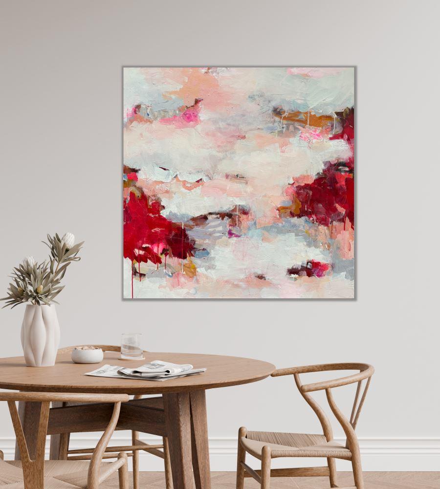 This lyrical, abstract painting was inspired by an exploration of the theme of love. With 'Speaking From the Heart' I explore the theme of authenticity, openness and connection when we express ourselves in a way that opens us up to vulnerability. Tender as well as difficult feelings might be communicated to another person. The painting is inspired by the delicate feelings that this kind of conversation evokes.