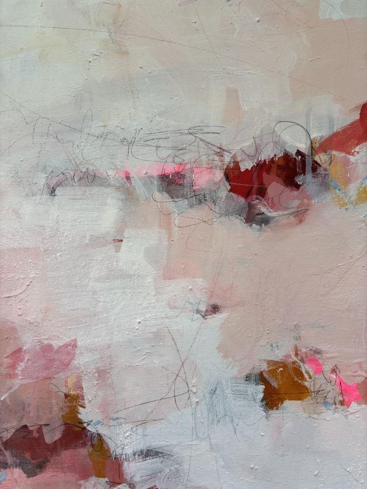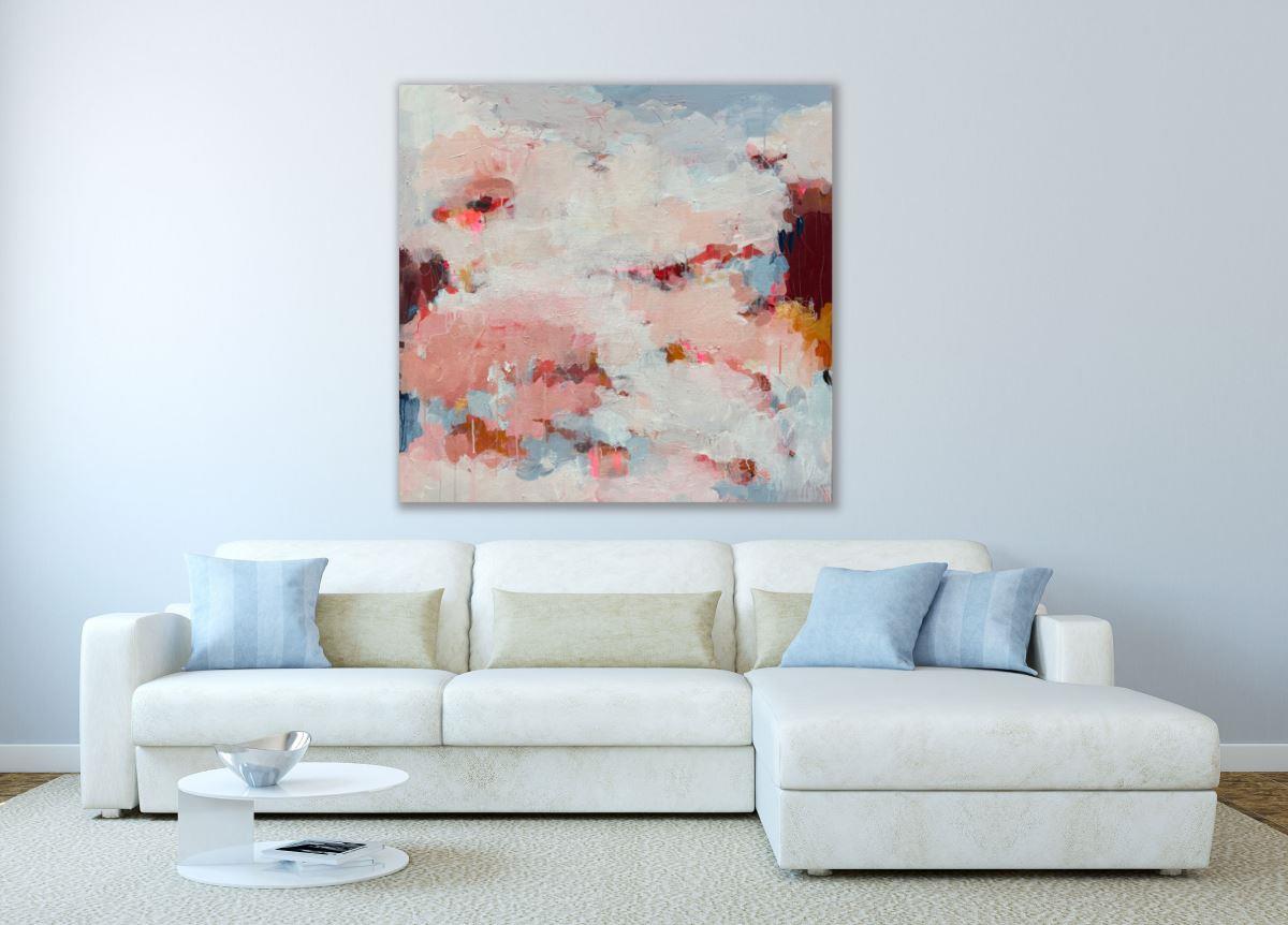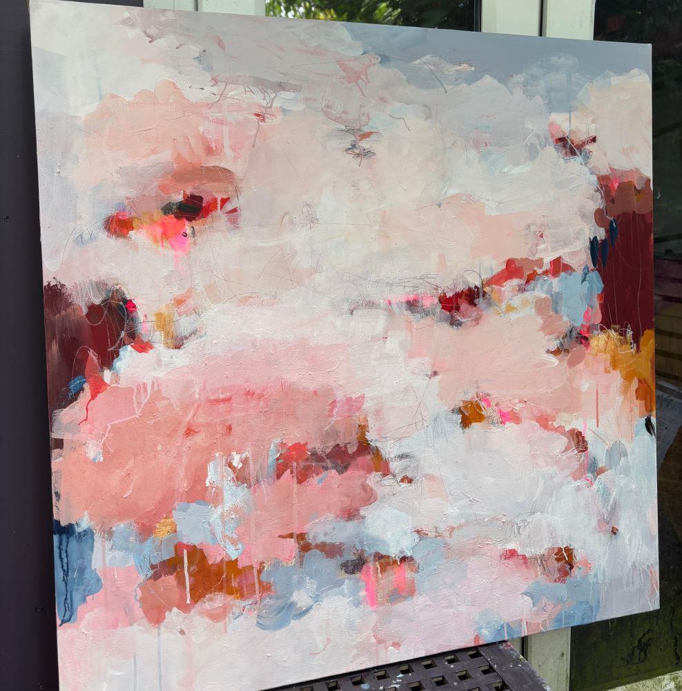 This lyrical, abstract painting was inspired by an exploration of the theme of love. As a therapist with a particular interest in relationships, I have learned over the years that love is the most important theme of all for most people, either through its absence or the experiences of loving and being loved. 'Touch Of An Angel' speaks of tenderness and softness; that moment when we experience a special and deep connection with another person which may be experienced as being touched by an angel.