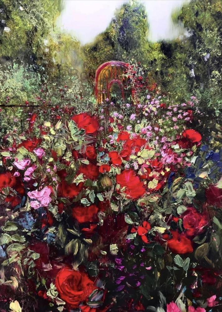 Roses are a staple in many English gardens, including my own. This painting is a work of imagination, the aim being to pack as many roses into a garden as possible!