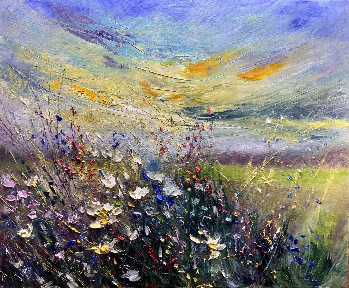 A corner of a farmer's field kept wild to encourage wild flowers and pollinators. Featuring bold, impasto brush work.