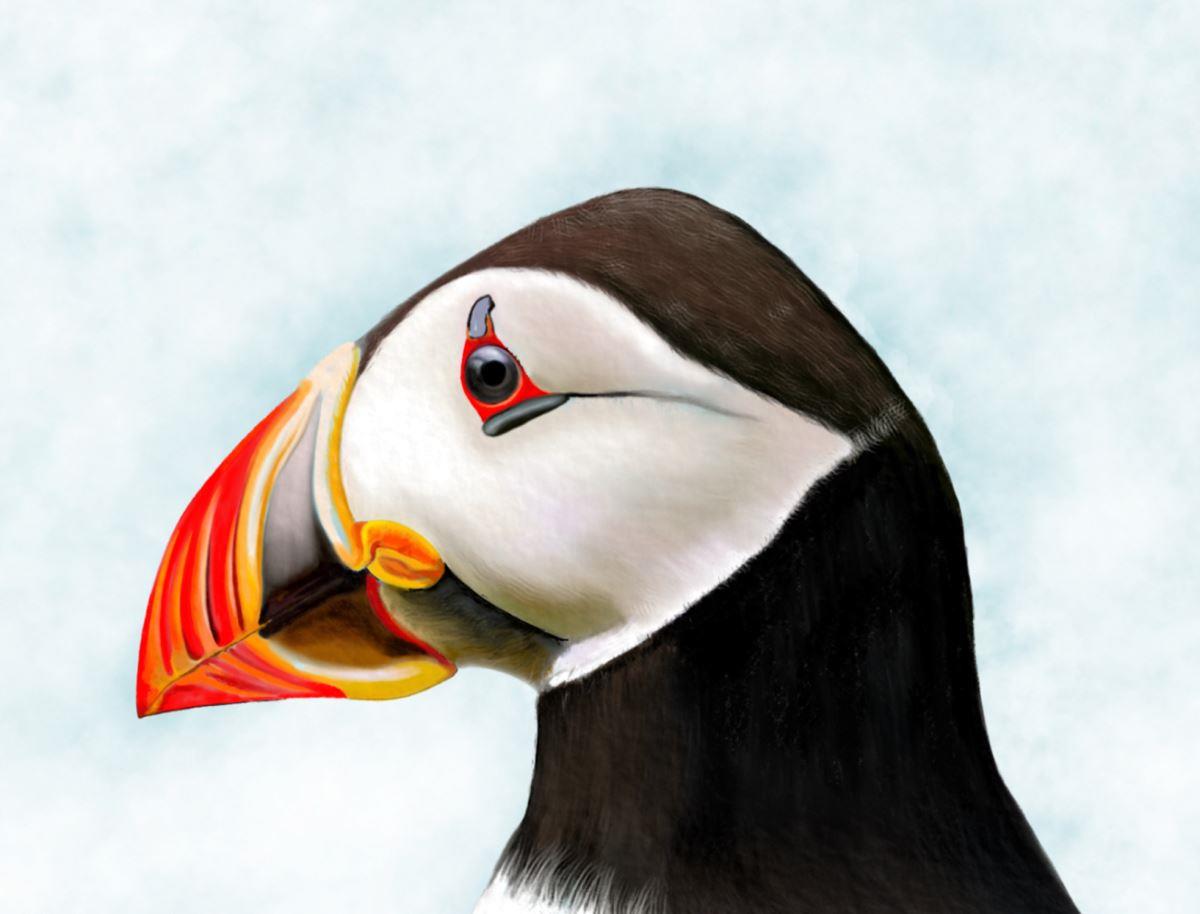 This artwork captures the unmistakable charm of the Atlantic Puffin (Fratercula arctica), often affectionately known as the “sea parrot.” Perched proudly upon a rugged coastal rock, the puffin is depicted in exquisite detail — from its striking black-and-white plumage to its vivid tri-coloured beak of orange, yellow, and slate-blue, which glows most brightly during the breeding season.