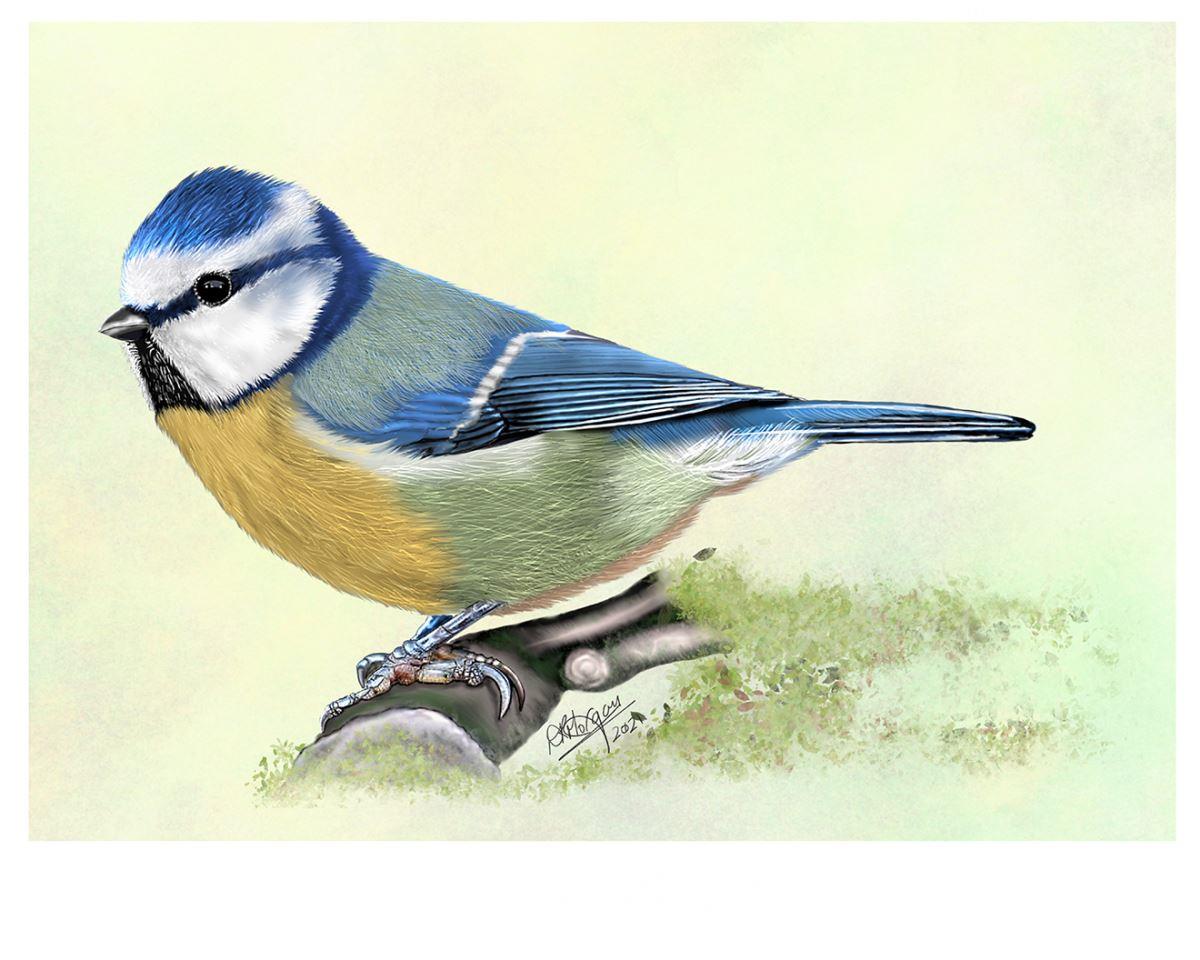 The Blue Tit (Cyanistes caeruleus) is one of Britain's most familiar and endearing garden birds, celebrated for its lively spirit and acrobatic feeding. With its azure crown, green back, yellow underparts, and bold black eye-stripe, this little bird is a splash of colour against woodland and garden greenery.