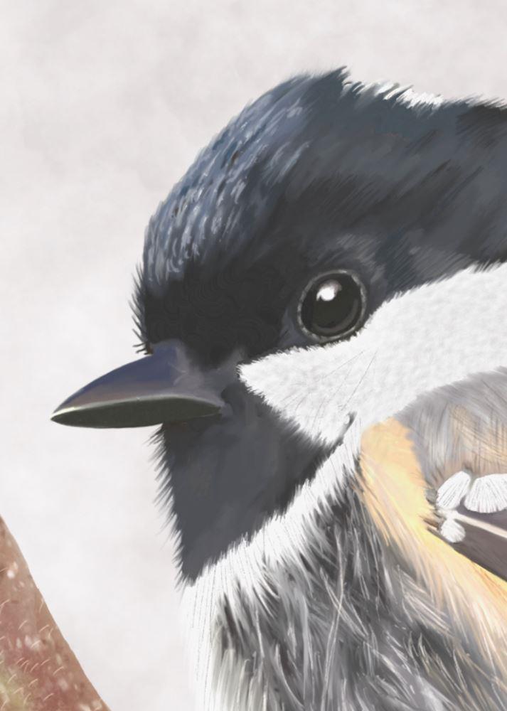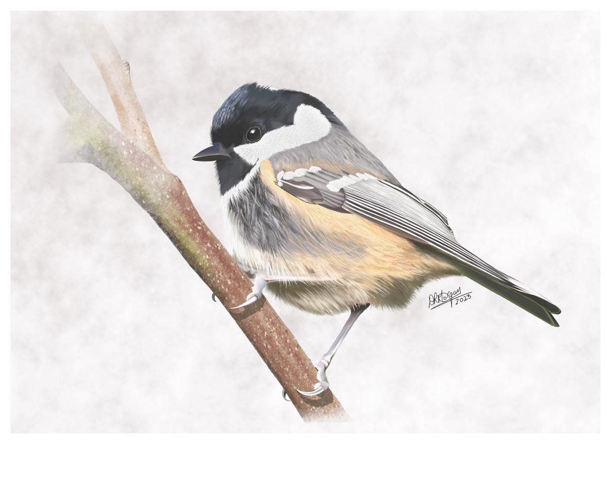 This beautifully detailed artwork portrays the Coal Tit (Periparus ater), a small but spirited member of the tit family. With its striking black cap and bib, crisp white cheeks, and soft grey-brown back with pale underparts, the Coal Tit is instantly recognisable. The artist has captured its delicate features and fine feather textures with precision, while the bird's poised stance on a slender branch reflects its alert and lively character.