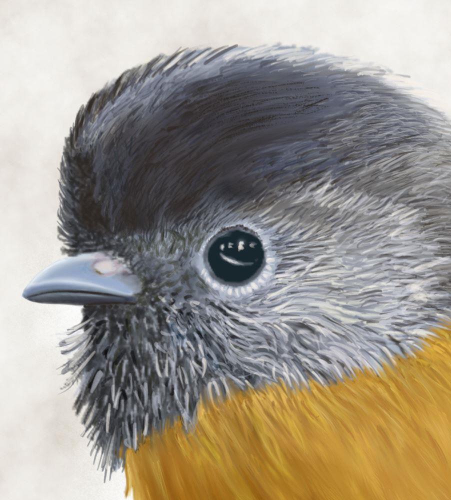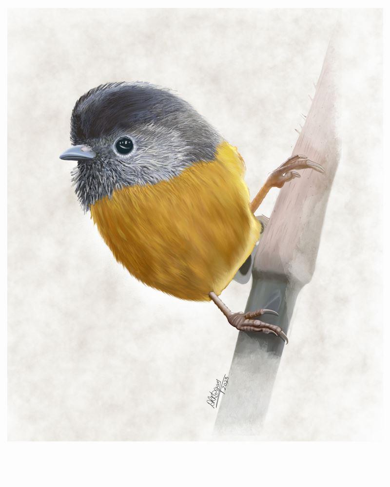 This exquisite Giclée print captures the delicate charm of the Gold-breasted Fulvetta (Lioparus chrysotis), a tiny jewel of the Eastern Himalayas and parts of Southeast Asia. With its soft slate-grey head, bright golden breast, and finely textured plumage, this small passerine radiates a quiet yet captivating beauty.