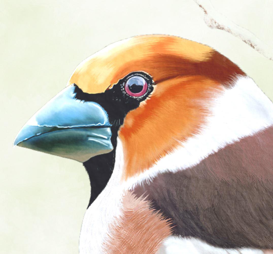 This striking Giclée print captures the Hawfinch (Coccothraustes coccothraustes), a bird of quiet power and rare beauty. Its massive bill, soft chestnut body, bold black markings, and flashes of sapphire-blue on the wings give it a regal and unmistakable presence. Perched with poised strength on a bare branch, the hawfinch seems both elegant and formidable.