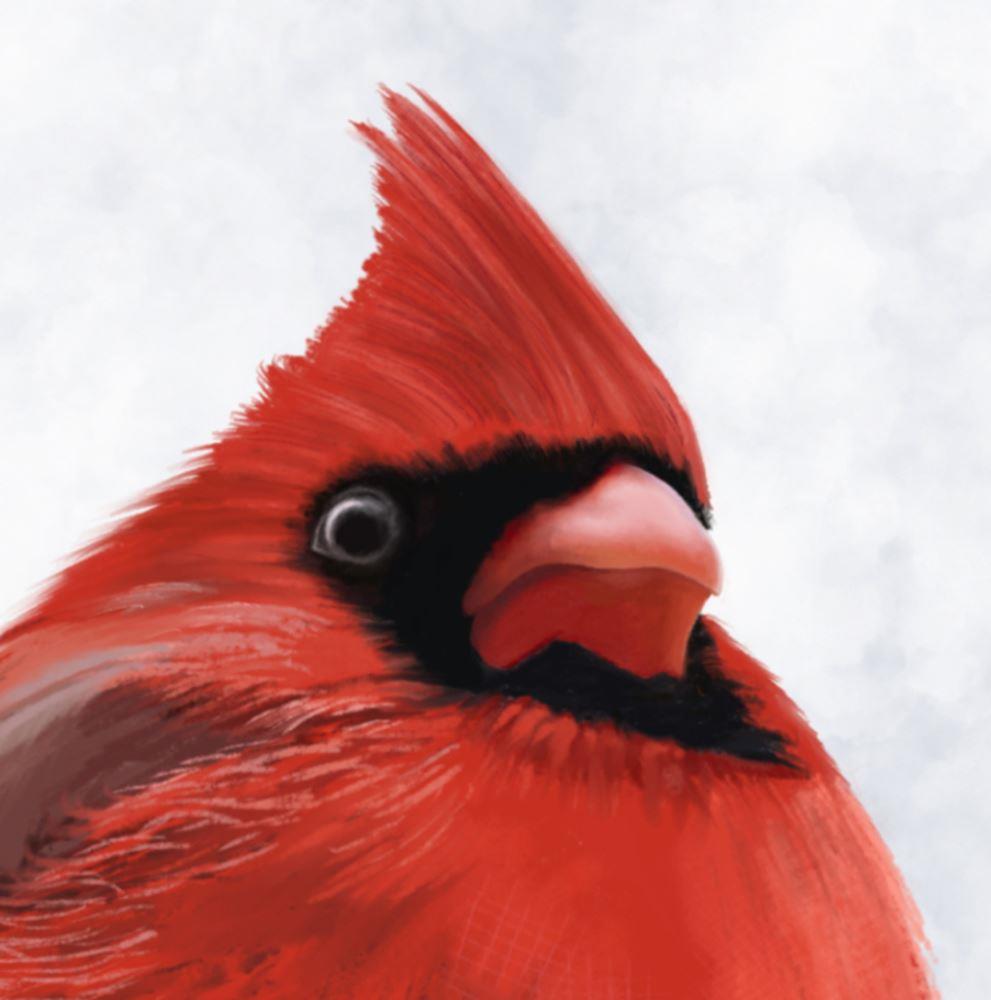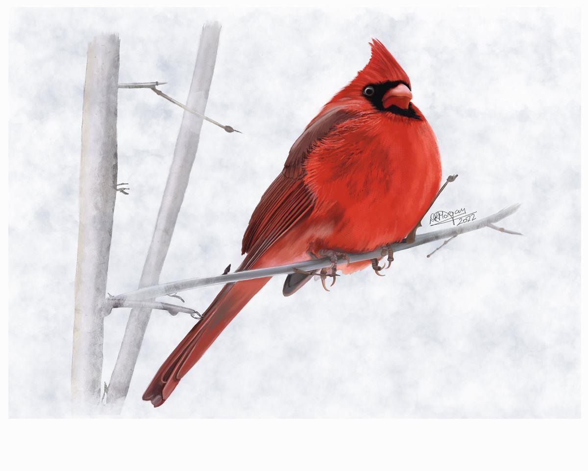 The Northern Cardinal (Cardinalis cardinalis) is a bird that radiates beauty and vibrance, its brilliant scarlet plumage and bold crest making it one of the most striking sights in the avian world. This artwork captures the bird in crisp winter light, perched proudly against pale branches, its black facial mask intensifying the vivid red feathers that have long made it a symbol of vitality and spirit.