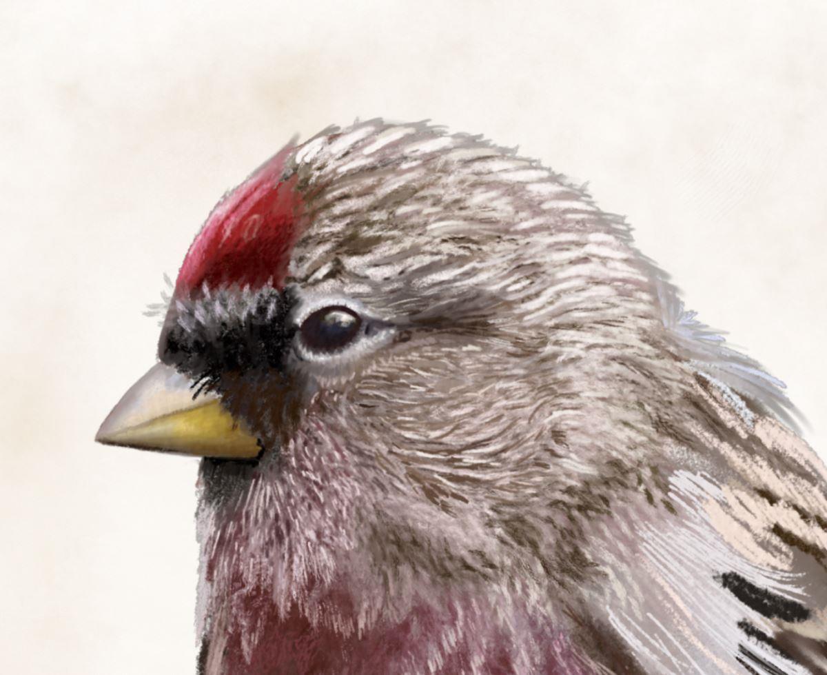 Delicately perched on a branch, this finely detailed artwork captures the charm of the Redpoll (Acanthis flammea), a small yet striking finch admired for its resilience and vibrant plumage.