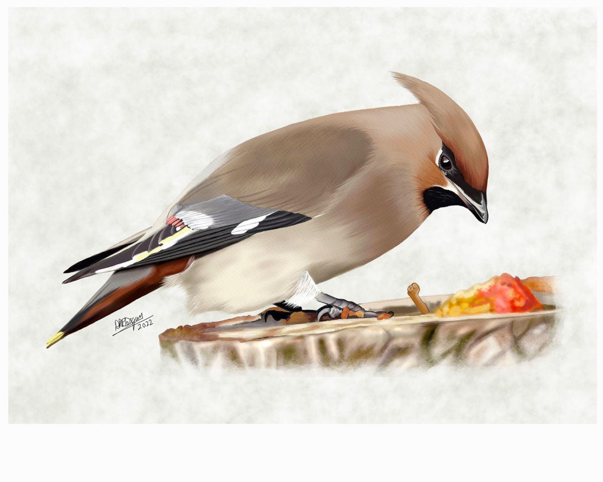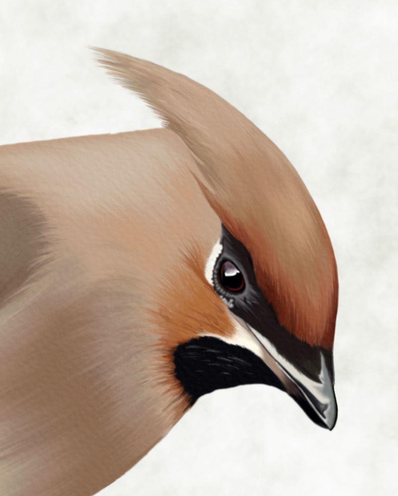 The Waxwing (Bombycilla garrulus) is a striking winter visitor, celebrated for its silky plumage, bold black mask, and the red, wax-like tips on its wing feathers from which it takes its name. In this artwork, the bird is captured delicately feeding, its crest raised in quiet elegance.