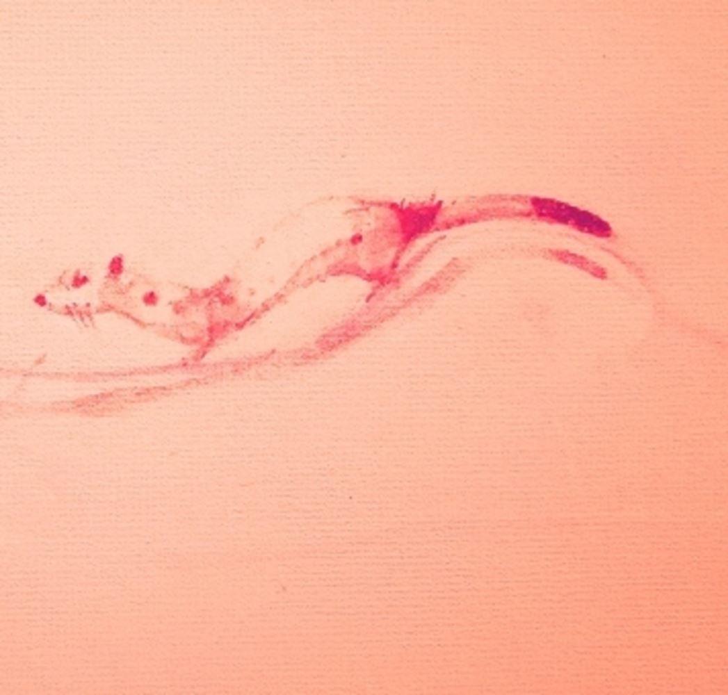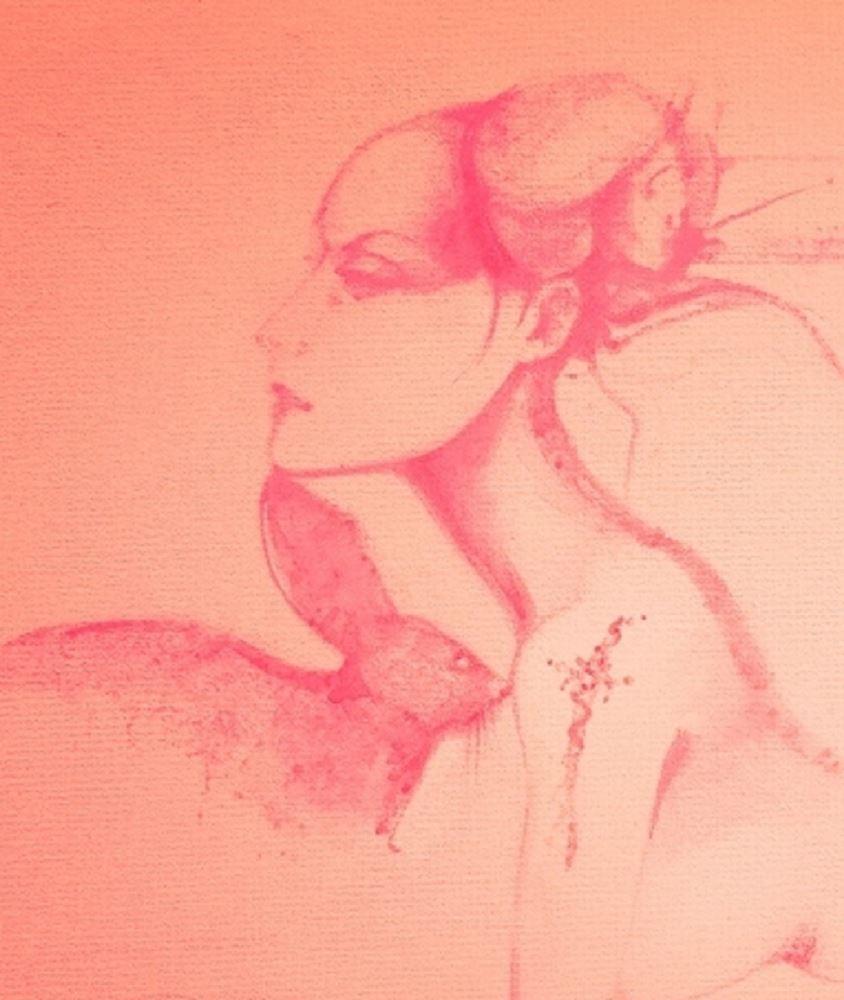 part of a series of paintings that explore the overlap between the human and the animal world...their differences and their similarities and the contrasts that they can create. The rabbit is nervous about the sable but the woman has made them pets, so they become compatible in time