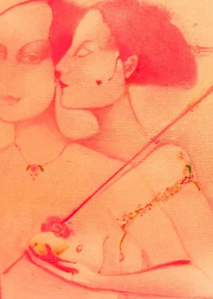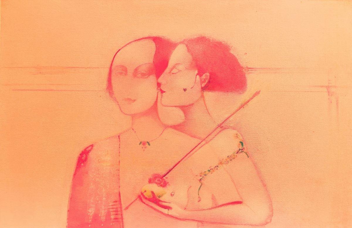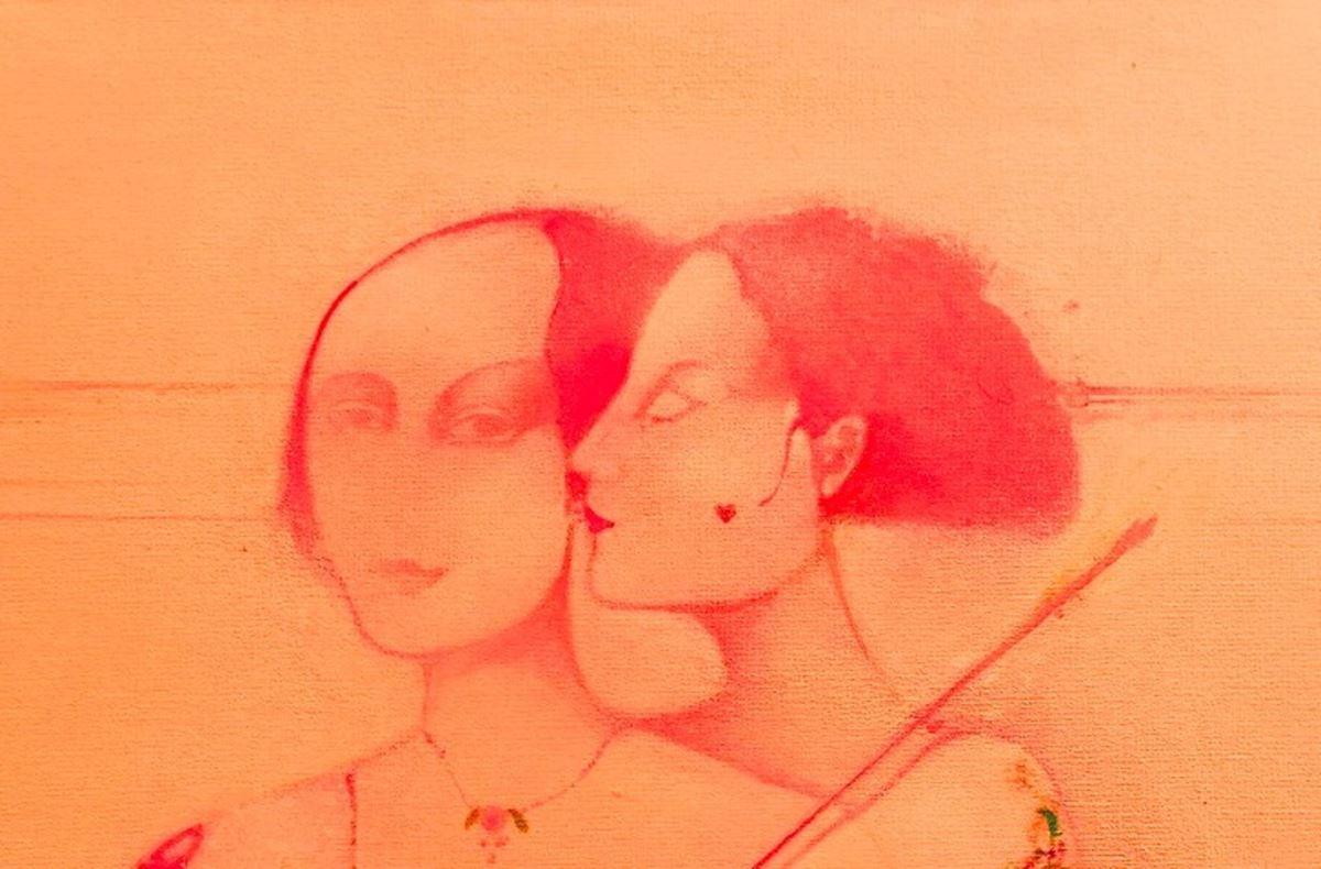 Two women embrace. The painting contrasts the orange in the subject title with the lemon that the woman is holding as a symbol of the differences between peoples affections. One of the women has a tiny orange on her pendant/chain to highlight the reference in the paintings' title.The painting uses the title of Jeanette Winterson's celebrated book. The lemon suggests the possibility of bitterness and love can be fickle but also, can be strong, as suggested by the arrow piercing the rose
