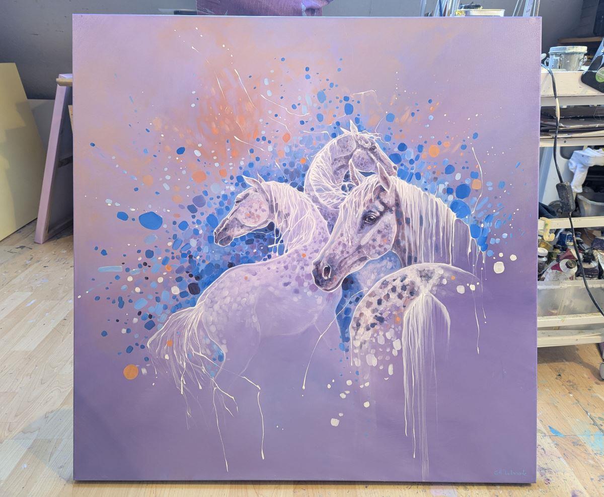 A Symphony of horses is a semi-abstract oil painting of three Arabian horses. It is 36x36x1.5 inches. The three pale dappled horses are positioned in the centre of the canvas with one looking questioningly back at the viewer and the other two looking right and left. The background is purple and the horses are pale whites and greys with dots and flashes of orange making interesting contrasts. The inspiration for it was simply a celebration of the beauty of horses and these horses are moving as if part of a dance or to some kind of equine symphony. They are going somewhere and the invitation is to follow… Painted on deep edge canvas, edges purple, ready to hang and comes with certificate of authenticity.