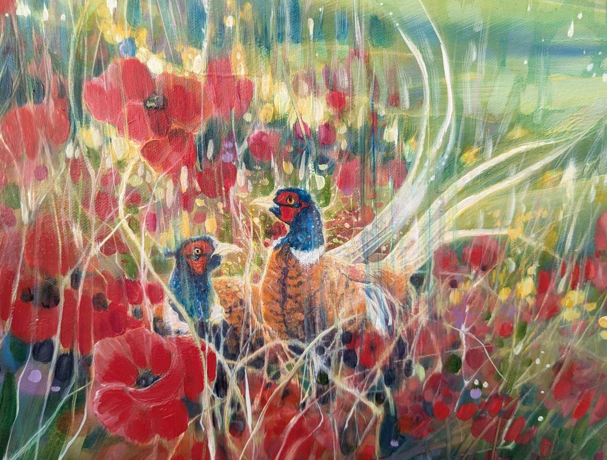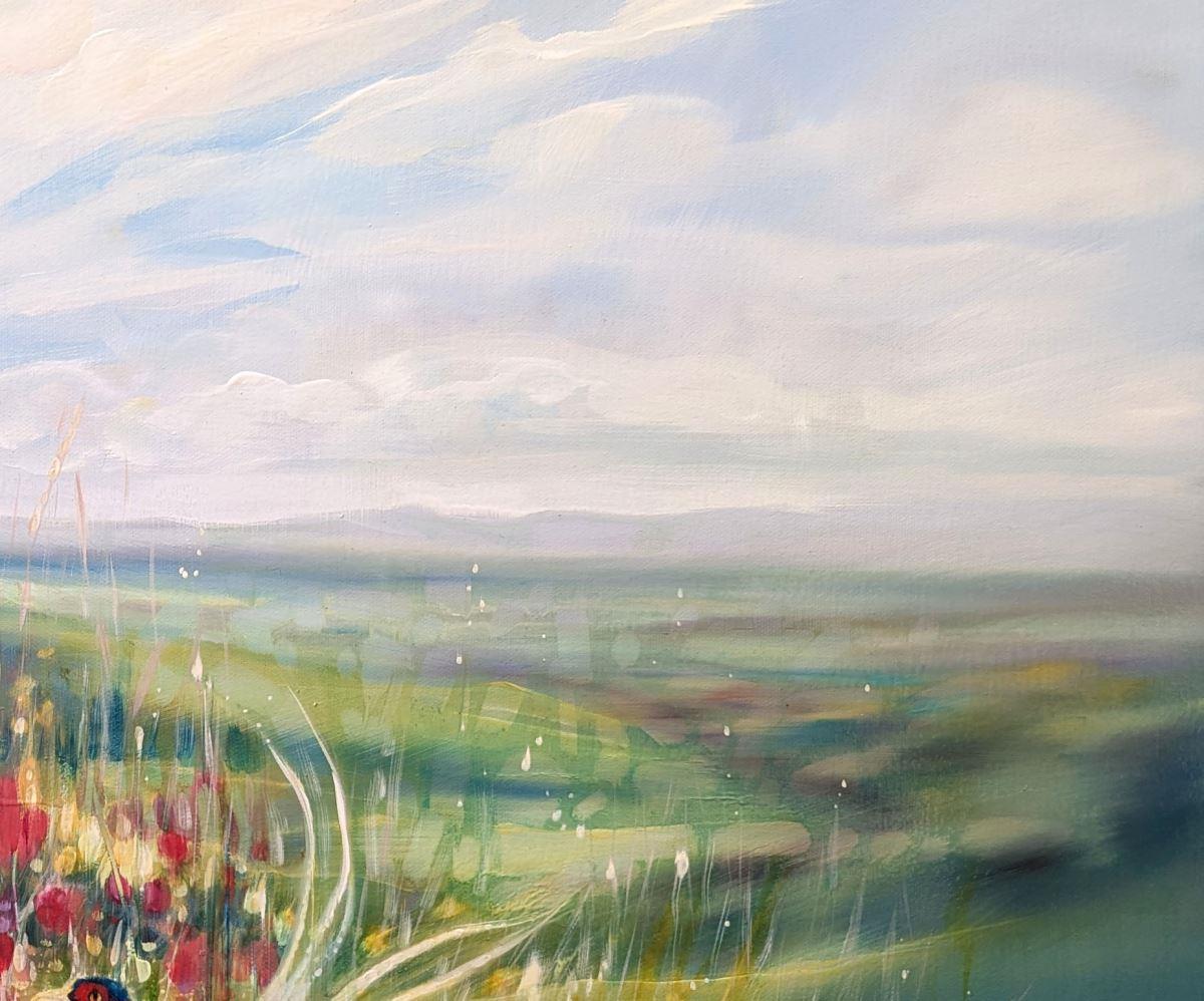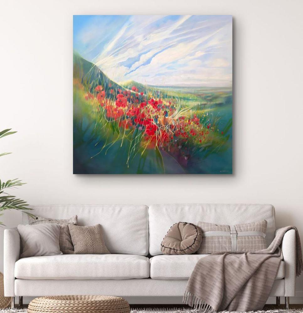 A Timeless Magic is a semi-abstract South Downs inspired landscape painting with red poppies and pheasants. It is 36x36x1.5 inches. The painting pays tribute to my many walks up and down the hills of East Sussex which is always breath-taking. This spot is near Ditchling and was made mostly from my memory of a late summer afternoon walk. There is a timelessness to hills as they have not changed as much as the other landscapes of England have. Spotting pheasants among poppies was a beautiful thing to see and I am happy to have caught this moment in time. The various layers and paint glazes give the overall impression of this scene being realistic but also strange when you look closer. Painted on deep edge canvas, white edges, ready to hang and comes with certificate of authenticity