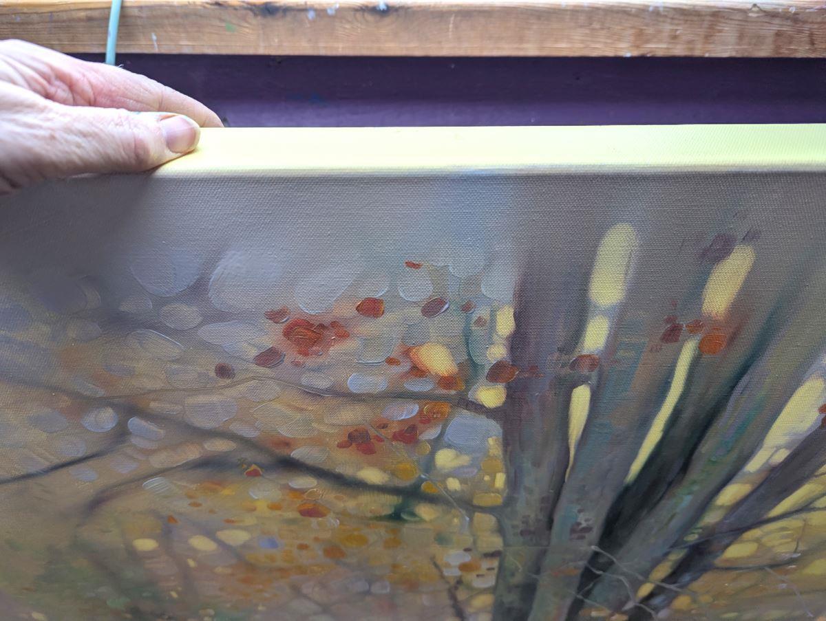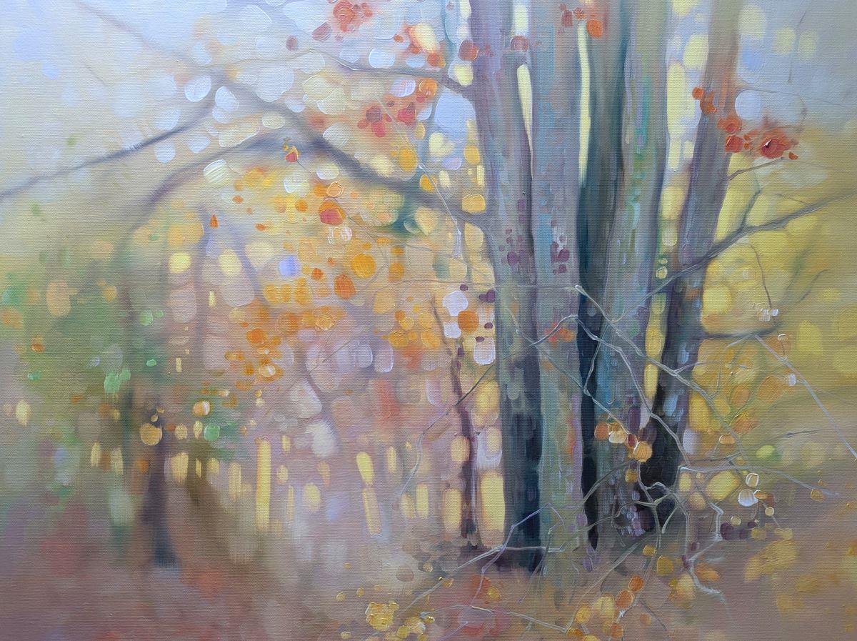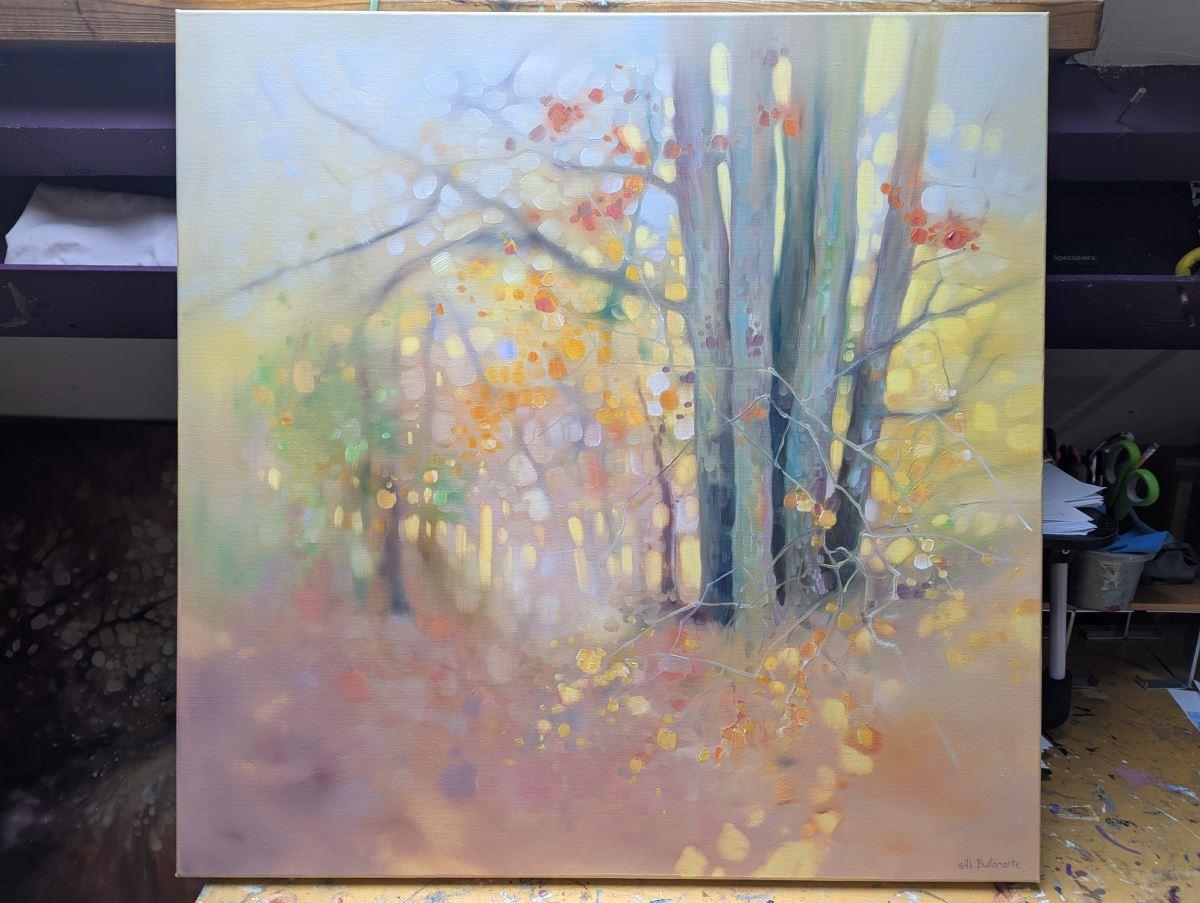 Ashdown Forest Path is an autumn path oil painting inspired by the Ashdown Forest of East Sussex. It is 30x30x1.5 inches. The painting was made after a walk in Ashdown Forest (Winnie the Pooh country) in October 2025. Beech trees had a green hue and were almost bare except for some dark orange leaves whilst the forest floor was golden and purple with fallen leaves. This particular path goes towards a clearing and stream in the distance where you can see the pale yellow light of a late autumn afternoon shining between the trees. I was trying to capture this moment in time along with the ethereal quality that is often present when you walk a forest path. Painted on deep edge canvas, pale yellow edges, ready to hang and comes with certificate of authenticity.
