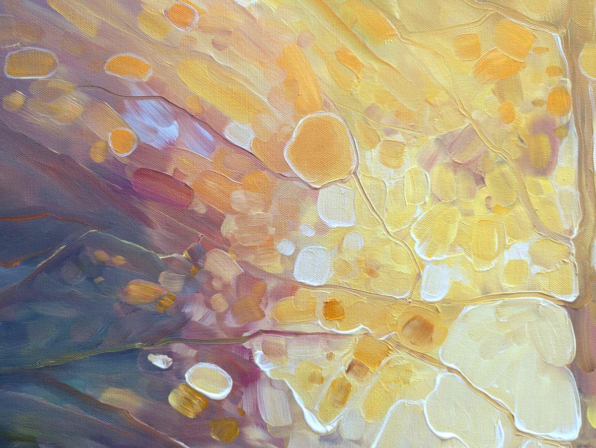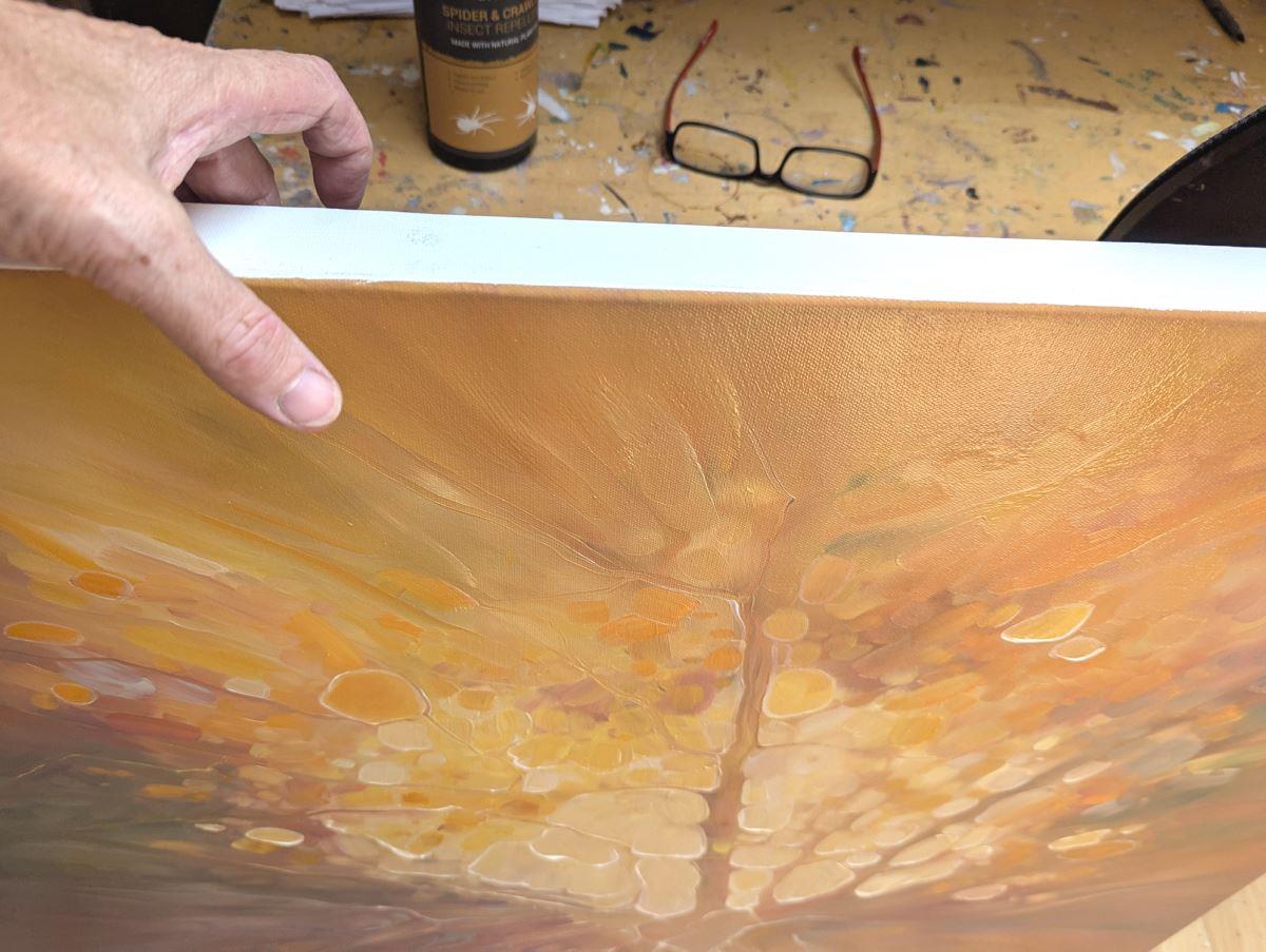 Autumn Beckons is an expressive, semi-abstract original oil painting of an Autumn path. It is 36x36x1.5 inches. The painting focuses on the centre of the painting where light is radiating out beneath the trees. It hints at revelation or hope or some kind of promise – or at least that is what it says to me! The painting was inspired by actual autumn walks in an around the Ashdown Forest (of Winnie the Pooh fame) and the Weald of Sussex where there are plenty of woodlands and copses and nooks and crannies that I never tire of exploring in different seasons. Painted on deep edge canvas, edges white, ready to hang and comes with certificate of authenticity