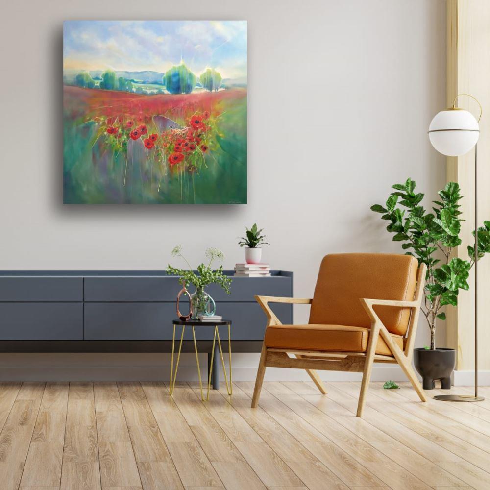 Beautiful England is a summertime poppies and pheasants inspired contemporary English landscape painting. It is 40x40x1.5 inches. The painting is semi abstract in style, predominantly in reds, greens and blues. It was made after a walk I took one August afternoon near Selmeston village which sits to the north of the South Downs hills near Alfriston. It sums up my joy of walking and my love of country landscapes - especially in summer when the wildflowers are out and the lovely idiot pheasants are squawking around in them. This painting is dedicated to all those people who are working to preserve our natural landscapes, nature, wildlife and birds and to anyone who is fighting stop the South Downs being built over. Painted on deep edge canvas, edges white, no frame necessary, ready to hang and comes with a certificate of authenticity