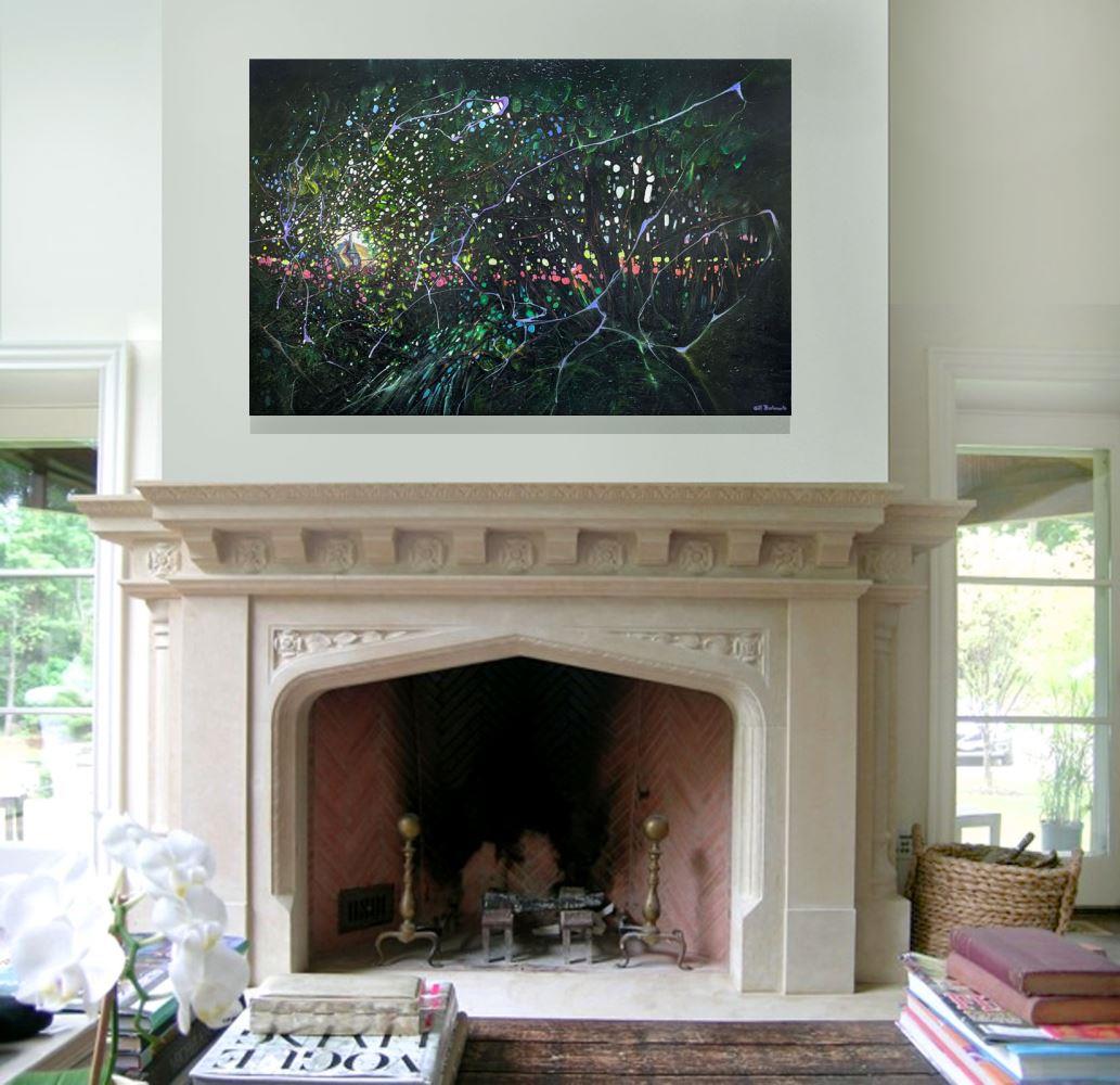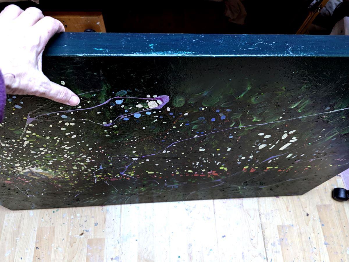 Dissolving Dream is a large textured abstract landscape oil painting about frustration and hope. It is 47x31x2 inches. The painting shows a dream house glimpsed through dark tangled trees. It is heavily textured in a dark iridescent green background. At first glance, it is completely abstract with lines and curves and spots of bright colour directing the eye around the painting. In one small section to the left, you can see an old English house with bright sunlight illuminating one side of it. There is also the hint of a stream and a field or flowers beyond. The painting represents a long-term dream of mine to live in a beautiful house in the countryside. I suspect the ship may have sailed on that dream so that is why it is both a hopeful painting and a wistful one. Painted on deep edge canvas, edges painted to match, ready to hang and comes with certificate of authenticity