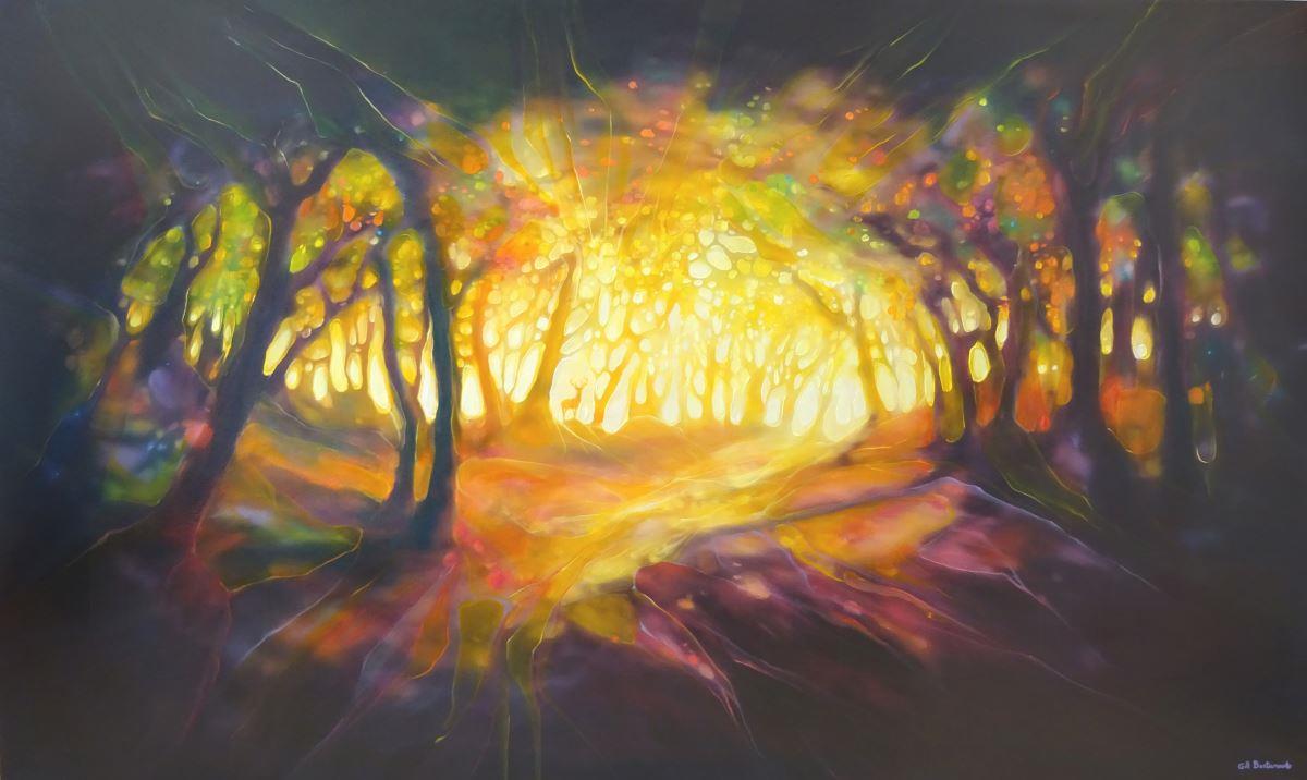 Forest Portal is a large panoramic oil painting on canvas of a glowing autumn forest clearing with a red deer stag and golden light through trees behind him. The painting brings the viewer out from a dark autumn forest and into a vibrant glowing clearing at the edge of the forest. It looks like a stage set where something is about to happen. A golden stag can be seen waiting between the trees. A portal is an exit or entrance to some other place. I sometimes get anxious in case I accidentally walk off my own time line into another when I walk in woodland such as this. I like this idea as the patches of woodland in England, especially, do have their own distinct atmospheres one to the next. This forest is like a large glowing cathedral where magic happens. The stag is a symbol of spiritual guidance common to many cultures. I made the painting with lots of overlapping layers of transparent colour and these layers reflect different colours when seen from different angles. It is dark but it is also rainbow coloured in a similar way to the reflective wings of a raven. The dark edges are mostly deep purple, blues and green. It is 36x60x2 inches on deep edge canvas, dark edges, no frame needed, ready to hang.