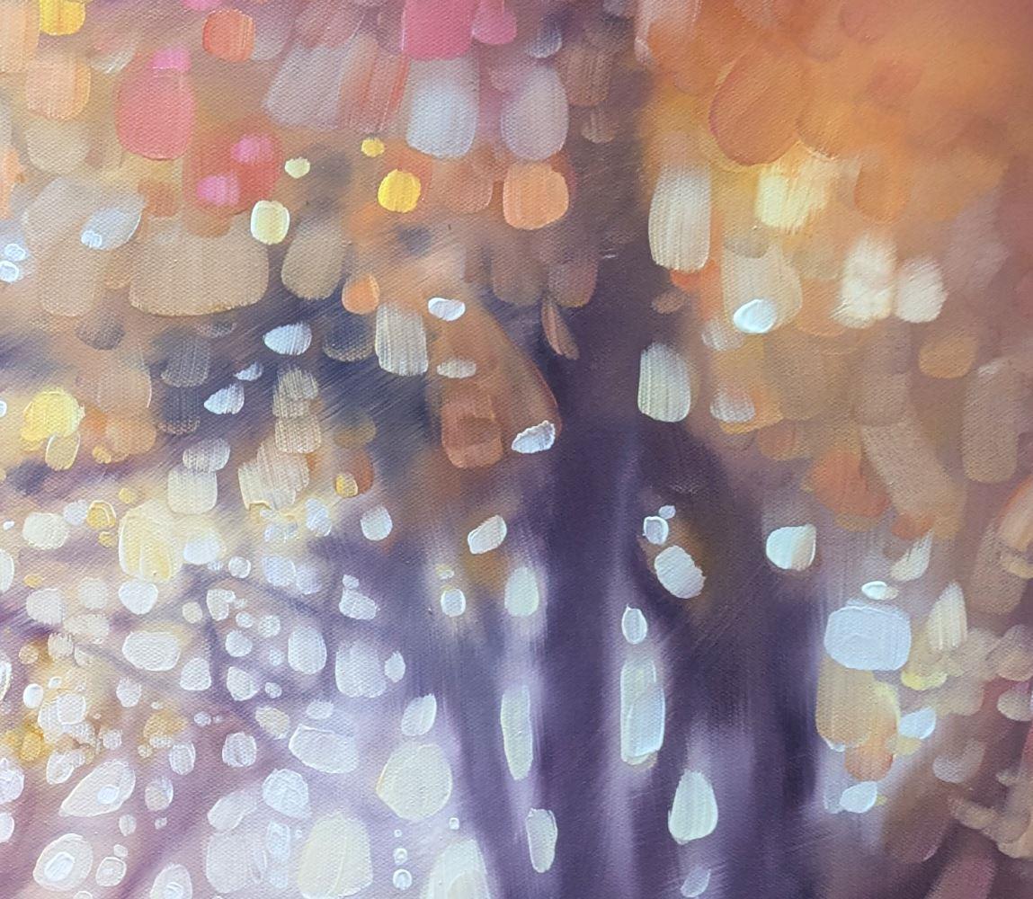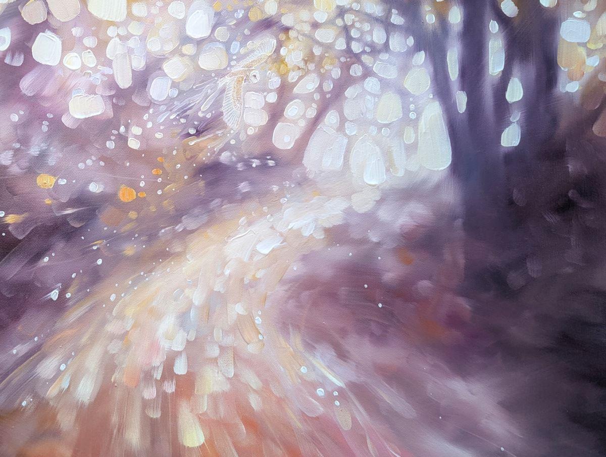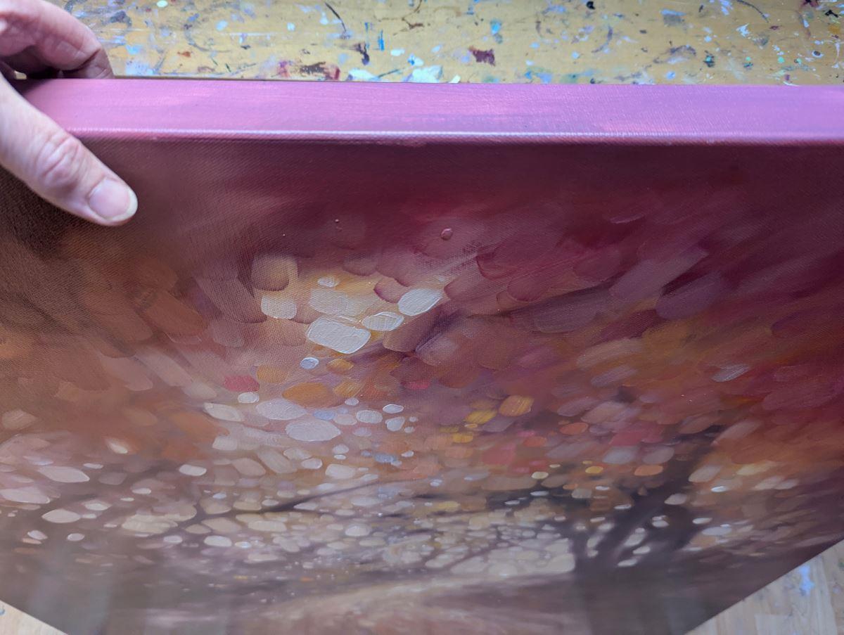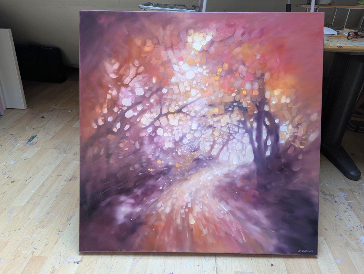 Hope Springs Eternal is a serene semi-abstract oil painting of an autumn woodland path with a barn owl in soft oranges, magentas and amethyst. It is 36x36x1.5 inches. The concept of this painting was to concentrate less on details and more on the overall feeling of walking a woodland path. In the High Weald area of Sussex there are thousands of small woodlands and forests and each one has a distinctive atmosphere. Sometimes the path's through are calming but other times they can be quite sinister. I always feel as if the trees are holding their breath when I'm walking beneath them, as are the hundreds of creatures who are no doubt watching my progress. There is a barn owl slightly hidden in it – she is simply there to bolster the magical quality I was trying to convey. Painted on deep edge canvas, painted to match, ready to hang and comes with certificate of authenticity