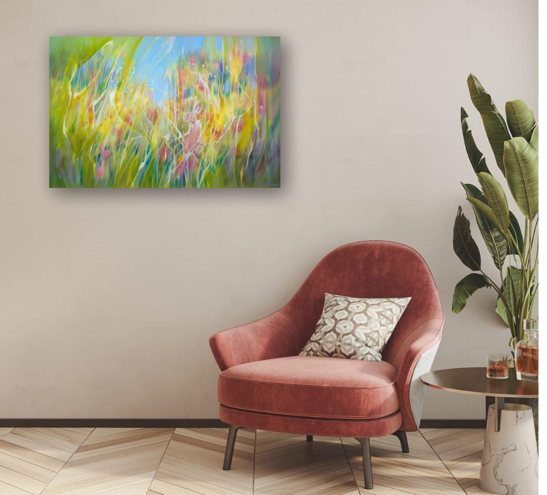 Meadow Born is a semi-abstract exuberant wildflower meadow painting with a hare appearing in it. It is 36x24x1.5inches. The painting was made by building up transparent layers of paint and lots of art nouveau style brush strokes and flourishes. The hare was painted in such a way as she looks ethereal and intransient. The inspiration is simply how wonderful spring time is and how fast it goes. The hare is best spotted in springtime so she fits ephemeral nature of the season. This is joyful painting and will enhance almost any room it eventually lives in. Painted on deep edge canvas, light green edges, no frames needed, ready to hang and comes with certificate of authenticity.