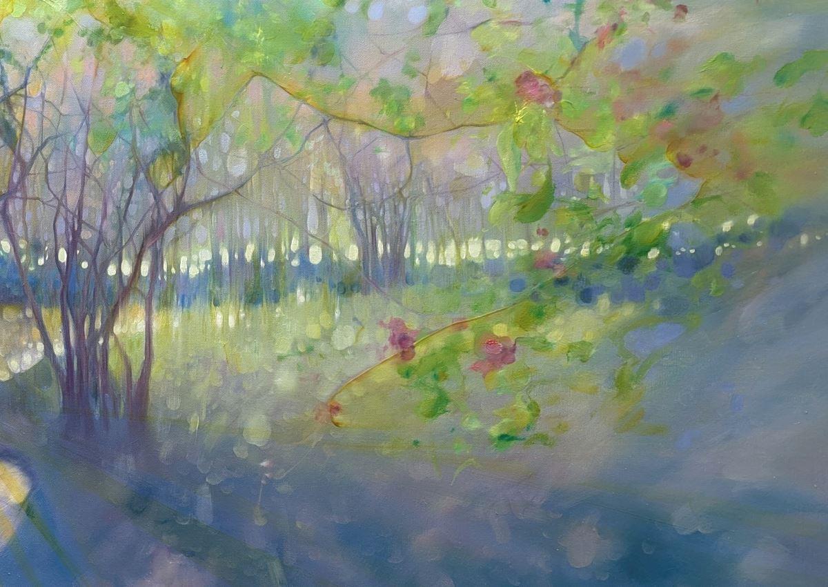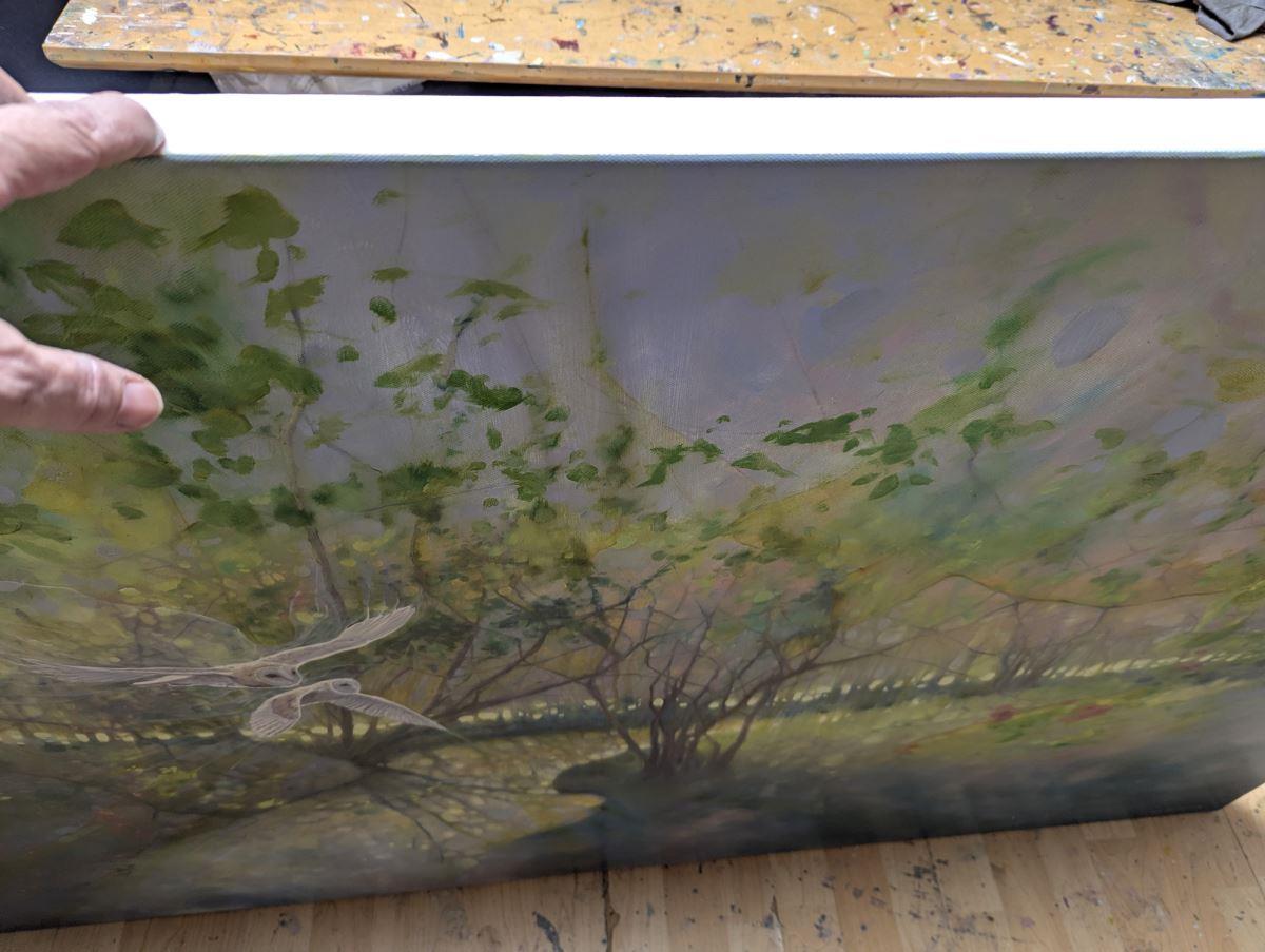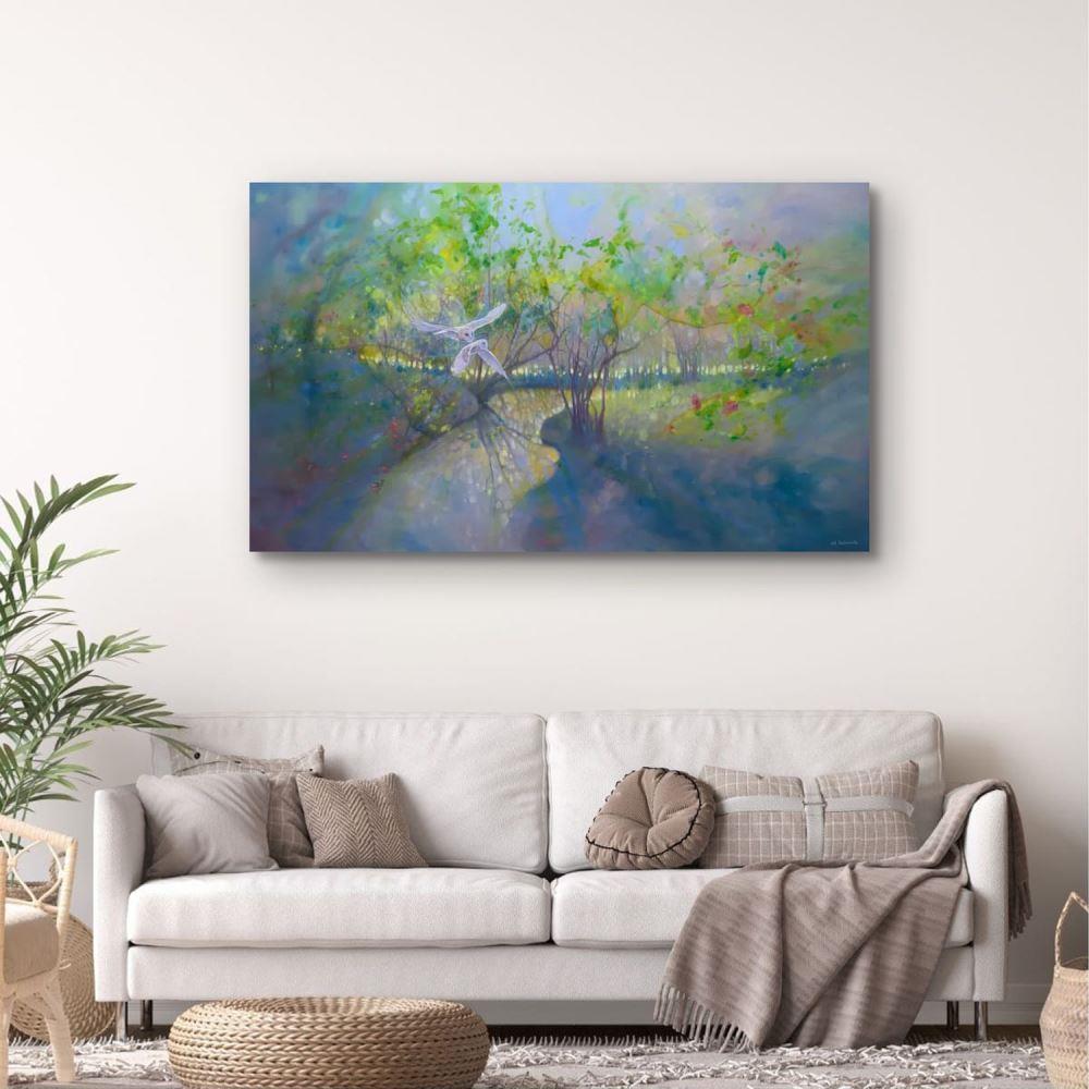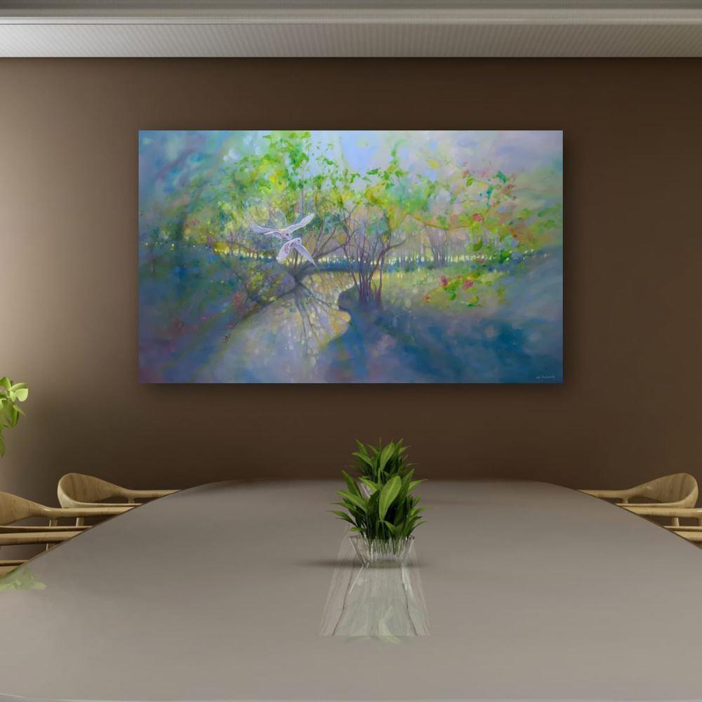 The Glade Portal is a very large oil painting of a springtime woodland glade with a river, barn owls, blossom and trees. It is 60x36x1.5inches. The painting shows the view across a shallow river with a meadow beyond gleaming through the trees at the edge. Two pale barn owls are flying across it looking as if they just escaped from somewhere else (hence the tile). There is a hint of blossom and bluebells and the luminous colours of springtime in England. The painting was originally inspired by a walk I took in the High Weald of Sussex where there are many forests, woodlands, streams and hills. There are always surprises around every corner and it is not hard to feel you are a fairy tale sometimes. This painting has a unique atmosphere to it and the colours change in interesting ways depending on the light. Painted on deep edge canvas, white edges, ready to hang and comes with certificate of authenticity
