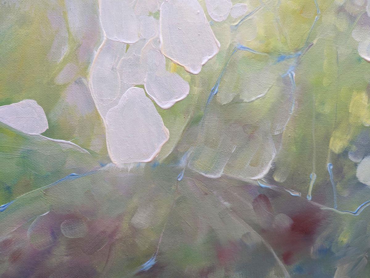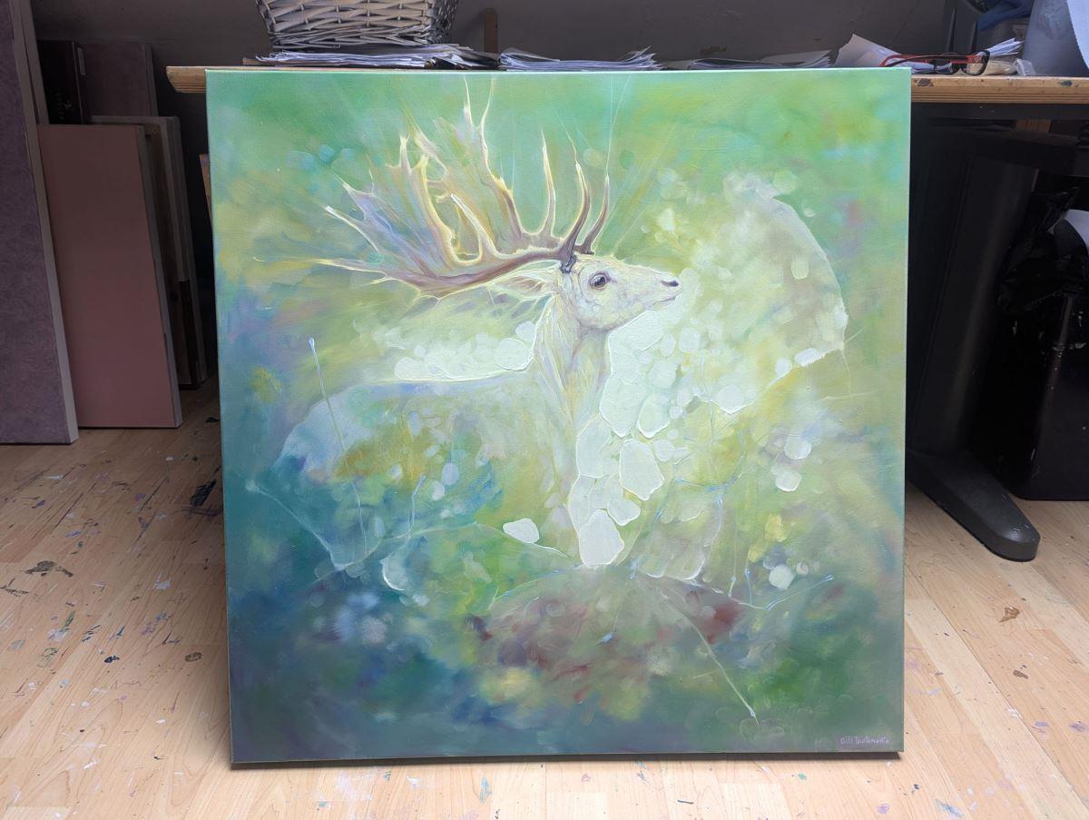 White Hart Rising is semi abstract contemporary oil painting of a white deer stag against a green and rainbow coloured abstract background. It is 30x30x1.5 inches. The inspiration for the painting is spotting fallow deer in the Sussex area. Deer look like ethereal creatures to me anyway but a white deer is even more so. In folklore deer are often revered as spirit guides or messengers and it is interesting how this idea crosses so many cultures. Painted on deep edge canvas, edges green, ready to hang and comes with certificate of authenticity.